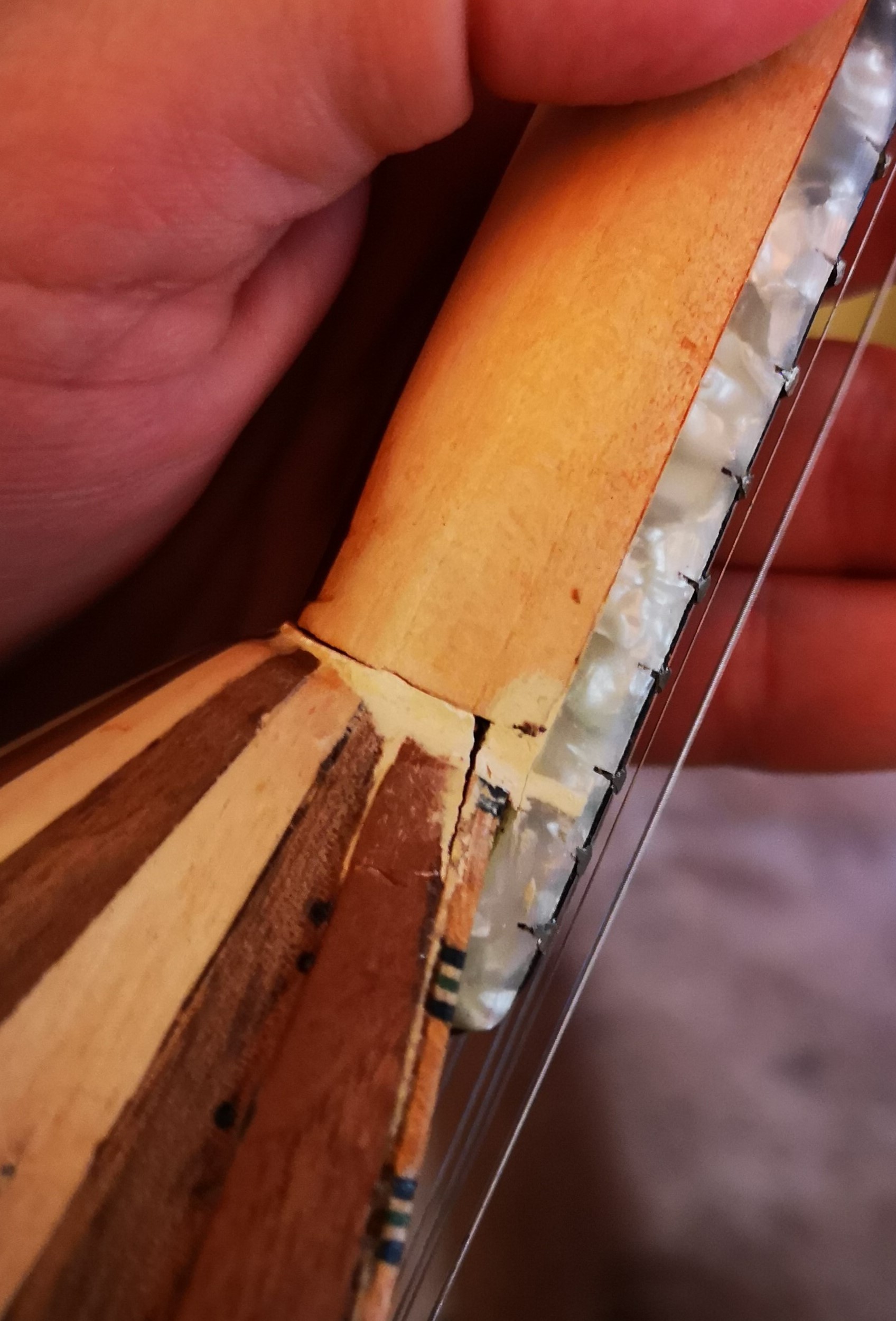Φίλε μου δεν χρειάζεσαι κάποιον ειδικό να το φτιάξει Αγόρασε μια εποξική Araldide ή Two ton epoxy ( Αυτές που είναι σε δύο σωληνάρια ή σύριγγες ) προσοχή όμως την αργή ( slow setting  ) Αυτές έχουν έως 90 λεπτά working time και 1 η και 2  μερες sεtting time Με ενα ξυραφάκι καθάρισε όσο μπορείς την παλιά Tidebond Πιστεύω ότι δεν υπάρχει λόγος να άγχεσαι για υπερβολικό καθαρισμό της άρθρωσης Βρες  μία λεπτή σπάτουλα από αυτούς που πουλάνε είδη ζωγραφικής ( ¨έχει πάχος μόνο 0,1 χιλ ! ) Θα σου είναι πολύ χρήσιμη για μελλοντικές κατασκευές ή επισκευές Γέμισε την χαραμάδα κόλλα και πίεσε το όργανο ανάποδα ( προς τα πίσω )