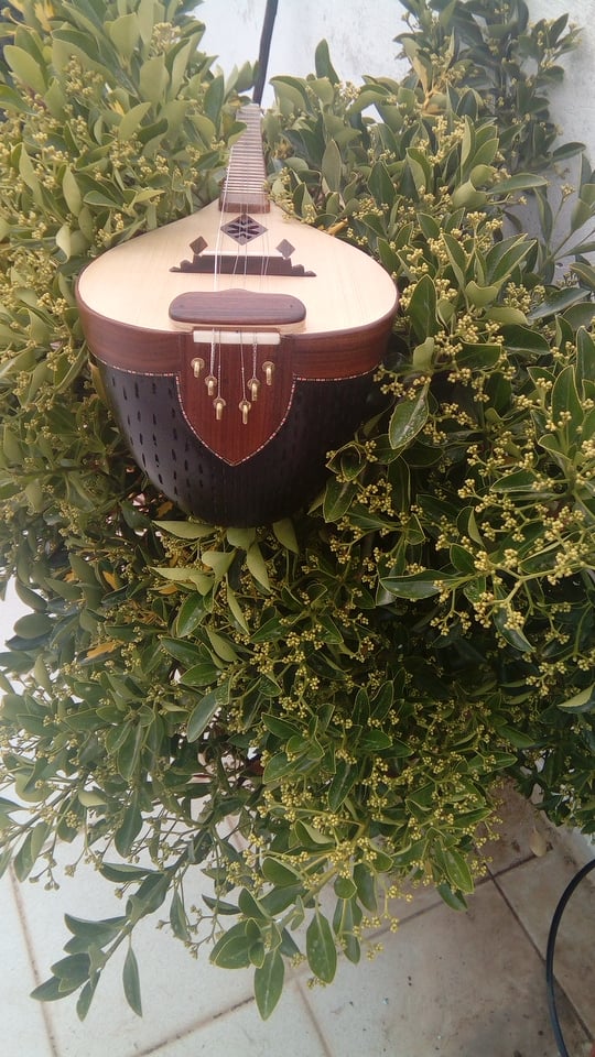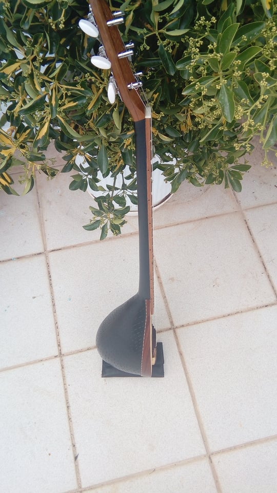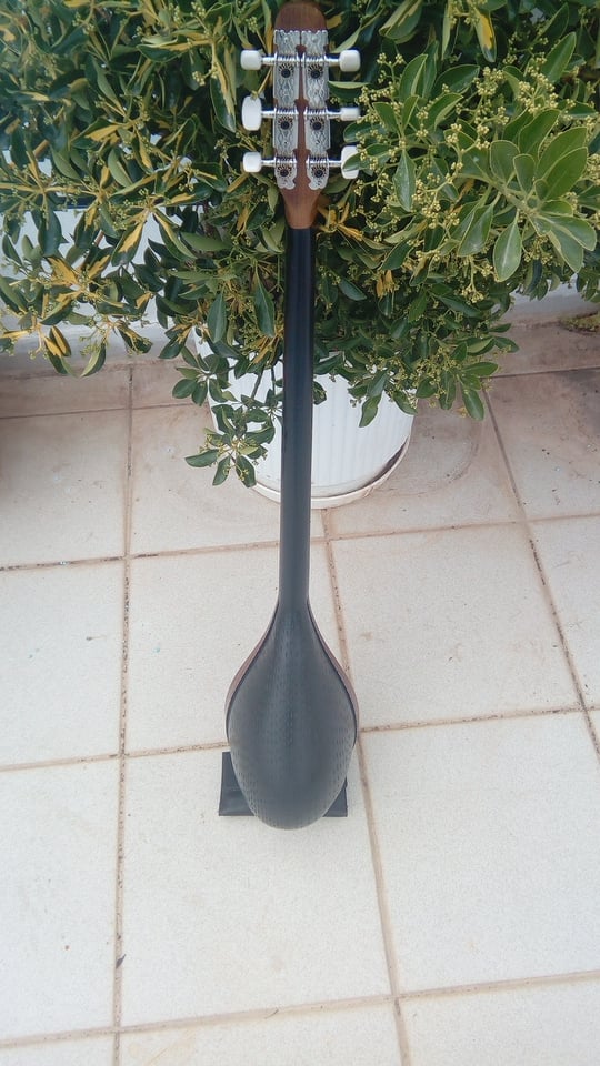 Η κλίμακα του είναι 61 εκ, το σκάφος είναι λίμπα, το μανίκι αποτελείτε από 5 τμήματα,  4 μαόνια κ το κεντρικό βέγγε, το καραολο είναι κ αυτό μαόνι, η ταστιέρα είναι τικ και τα σημάδια από έβενο, καπάκι έλατο, η τρύπα κ τα σχέδια στο καπάκι είναι από pao ferro όπως και τα πλαινά κ η κολάτζα τ σκάφους, η χορδιέρα είναι αυτοσχέδια κ οι χορδές πιάνουν σε μεταλλικά βιδωτά γατζάκια, το κόκαλο κάτω απ το καπάκι της χορδιέρας είναι για να μην πληγώσουν οι χορδές το ξύλο, ο καβαλάρης είναι κ αυτός pao ferro.