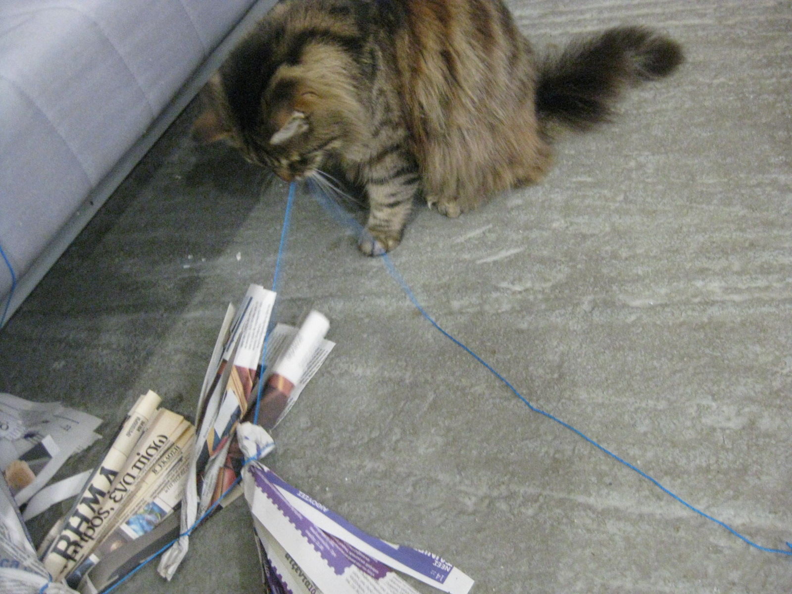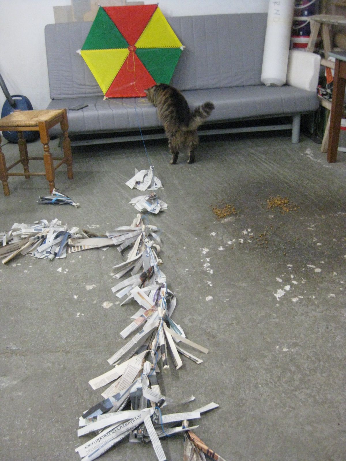 σε επιδιορθωσεις προχωρησε η γατα τις αυλης μας στην ουρα του χαρταετου, αφου επαιξε και λιγο με το σχοινακι (ετσι για να μην ξεχνιομαστε...)