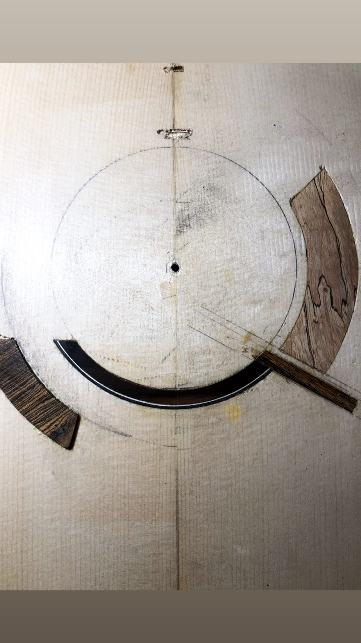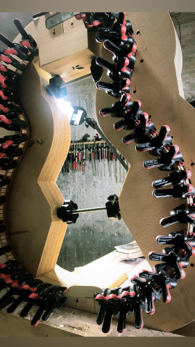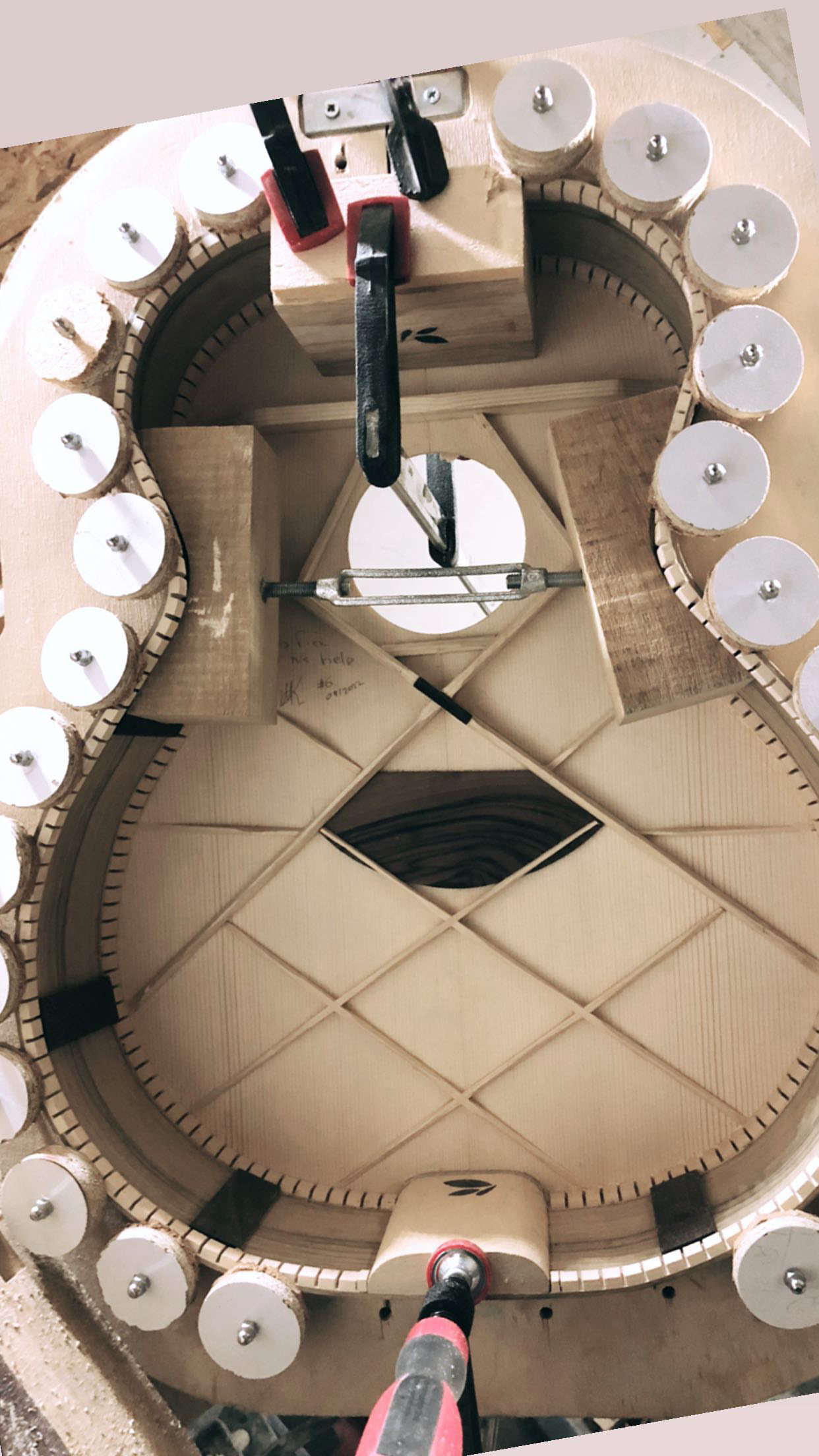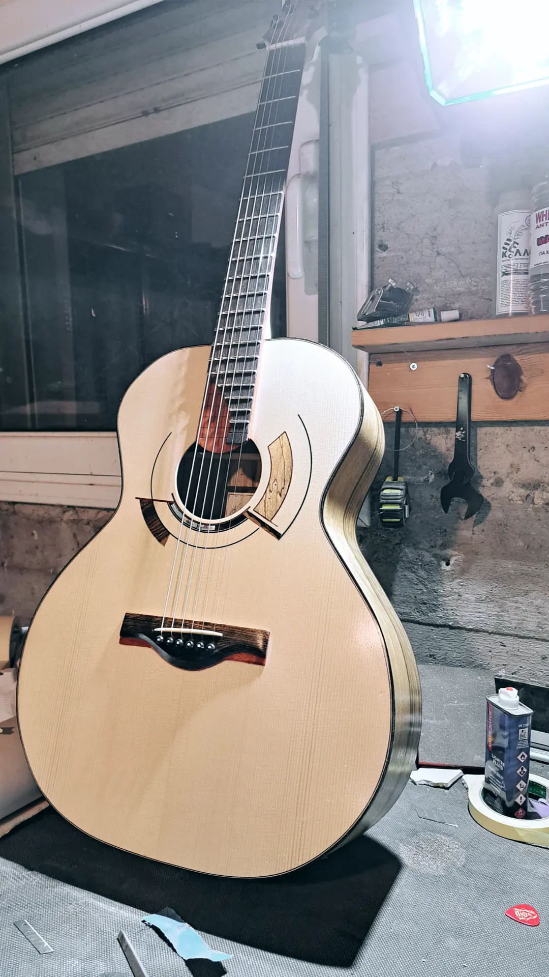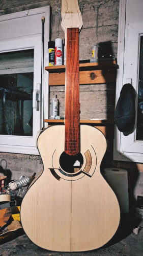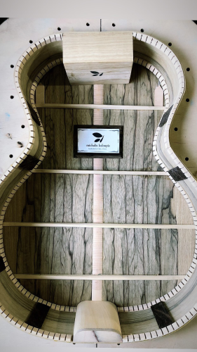 Το μανίκι είναι ελαφρώς flamed maple ,εξαιρετικά σκληρό και πολύ δύσκολο στην κατεργασία. Η γέφυρα είναι δυο ξύλα , padauk και bocote, βγήκε αρκετά ελαφριά και είμαι ευχαριστημένος. Το καμαρωμα σε σχήμα πλέγματος έδωσε πολύ ωραίο ήχο αλλά ήταν και πολύ χρονοβόρο. Φτιάχνω άλλη μια κιθάρα με τέτοιο καμαρωμα αλλά δε νομιζω να το ξανά προτιμήσω.