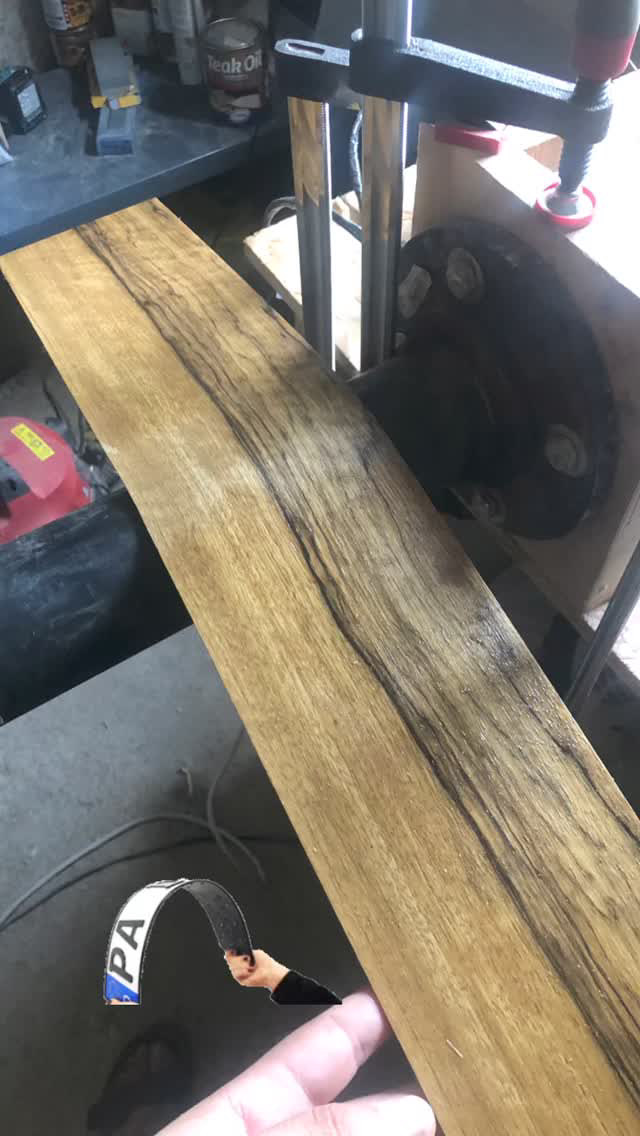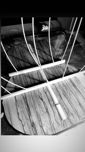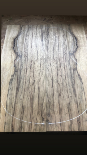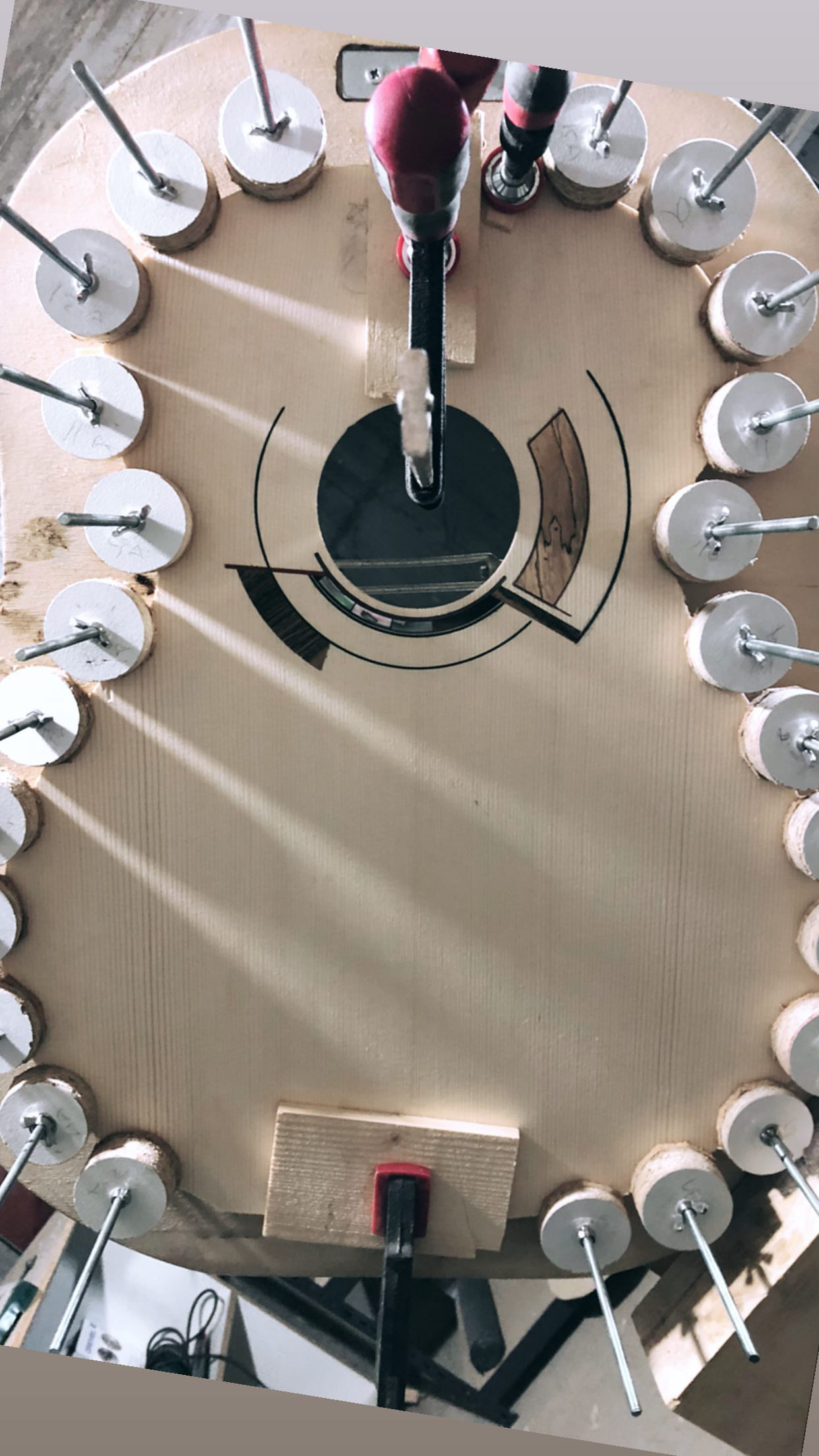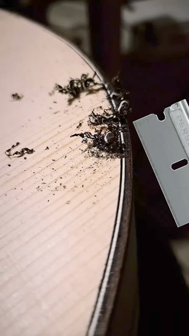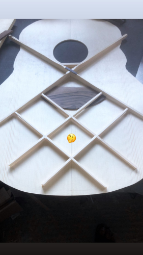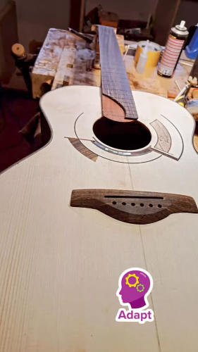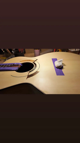 Το μανίκι είναι ελαφρώς flamed maple ,εξαιρετικά σκληρό και πολύ δύσκολο στην κατεργασία. Η γέφυρα είναι δυο ξύλα , padauk και bocote, βγήκε αρκετά ελαφριά και είμαι ευχαριστημένος. Το καμαρωμα σε σχήμα πλέγματος έδωσε πολύ ωραίο ήχο αλλά ήταν και πολύ χρονοβόρο. Φτιάχνω άλλη μια κιθάρα με τέτοιο καμαρωμα αλλά δε νομιζω να το ξανά προτιμήσω.