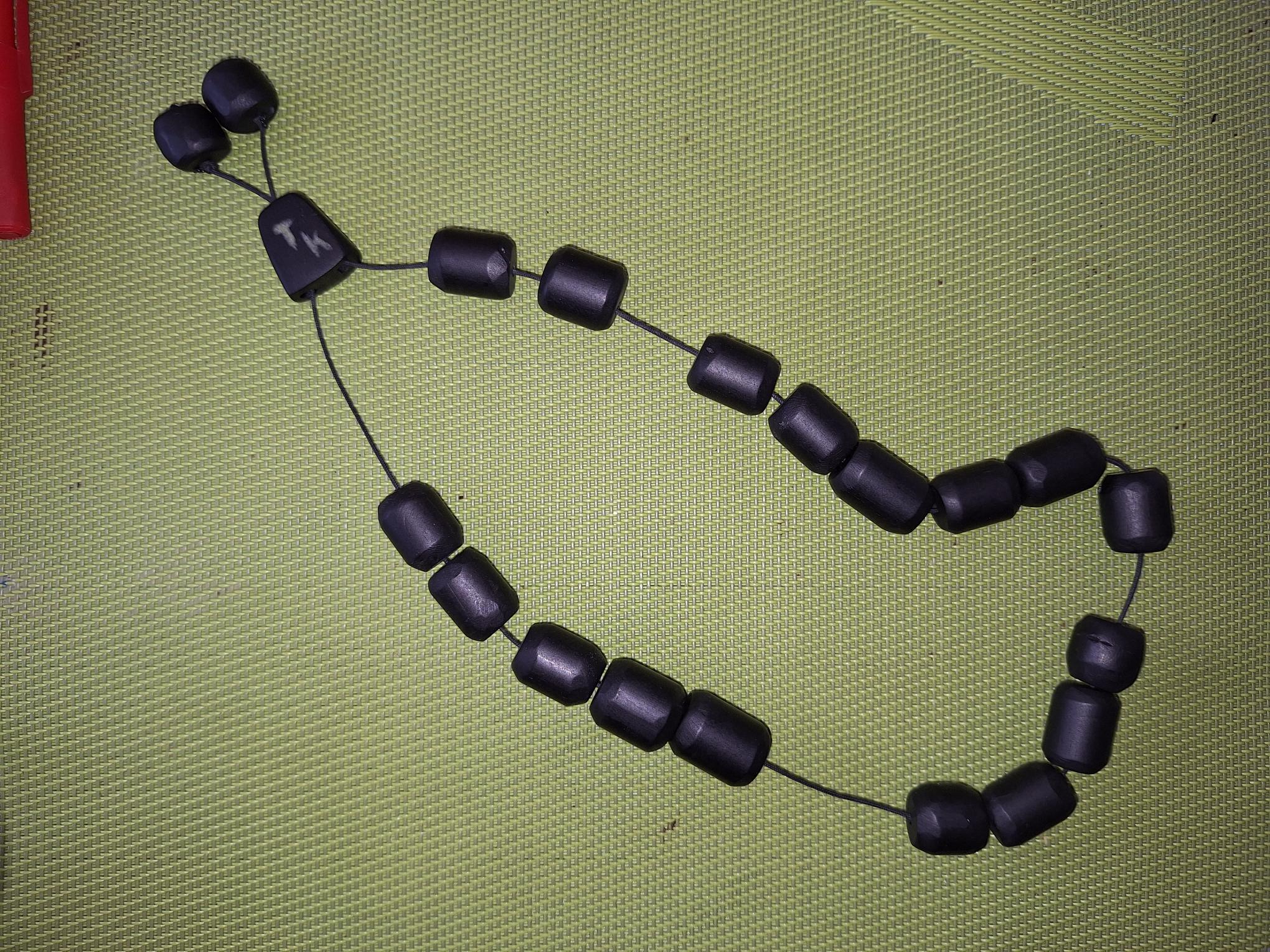 Πήρα έβενινες ράβδους τετράγωνικής διατομής και αφού έσπασα τις ακμές με το ροκάνι, έκανα υποδοχή για να χωράει στο δράπανο και με ράσπες λίμες και γιαλόχαρτα έφτιαξα ράβδους κυκλικής διατομής. Μετά έκοψα βαρελάκια και έσπασα τις νέες ακμές και έκανα τις τρύπες. Για το δέσιμο έφτιαξα ένα τραπέζιο από έβενο να περάσουνε τα κορδόνια. Στο τραπέζιο χάραξα τα αρχικά του φίλου μου ΤΚ που θα του δωρίσω το κομπολόι, τα γέμισα με σκόνη από κόκκαλο και τα σταθεροποίησα με κυανοακρυλική.