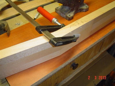 Scarf joint. Το κόψιμο του μπράτσου υπο γωνία ώστε γυρίζοντας το ανάποδα και κολλόντας το να έχουμε το καράολο του οργάνου.