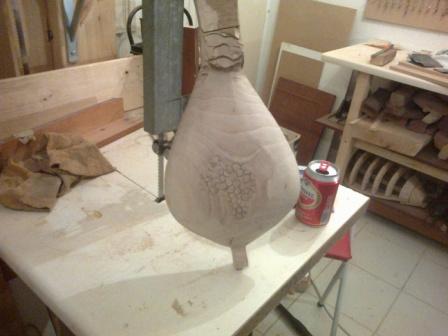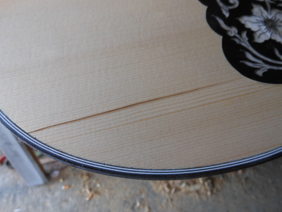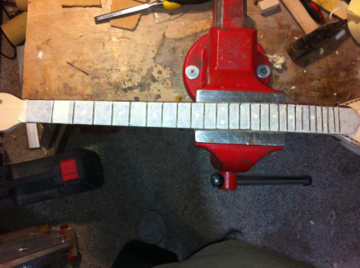 Περάστηκαν τα τάστα και έντυσα την ταστιέρα με χαρτοταινία κρατώντας τα τάστα έξω για να μπορώ να τρίψω τα τάστα χωρίς να τα πληγώσω την ήδη γυαλισμένη καί έτοιμη επιφάνεια από παλίσανδρο της ταστιέρας. Τριφτήκανε τα τάστα και ευθυγραμμίστηκε η ταστιέρα. Η χαρτοταινελια κρατήθηκε μιας και και ακολουθούν τριψίματα και  βαψίματα στο σκάφος και πρέπει η ταστιέρα να είναι προστατευμένη για να μην λερωθεί. Άλωστε τα πλαϊνά της ταστιέρας τα λοστράρω μαζί με το μάνικο και το καπάκι.