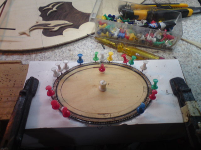 Παραθέτω 3 φωτογραφίες απο μπουζούκι που έχω σε εξέλιξη (μισοτελειωμένο) .Εδω εφαρμόζω αυτο που περιγραφω παραπάνω σε ροζέτα οβαλ που εχει 5 φιλετακια  ασπρο κόκκινο εν αλλάξ και ένα ετοιμο μαυρο-,  άσπρο Πιστεύω οι φωτο θα ξεμπερδέψουν την υπόθεση  Αν χρειαστεί επανέρχομαι , :D