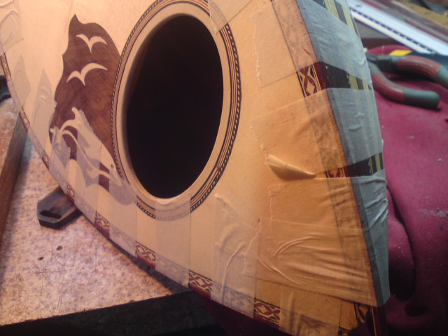 Όσο για το λύγισμα, όντως μπορεί να αποτελέσει πρόβλημα αλλά σκέφτηκα να μη το βάλουμε ως παράγοντα στην παρούσα φάση. Στο καπάκι της πρώτης κιθάρας που πέρασα έτοιμα κορδόνια (μαύρο, άσπρο, μαύρο, άσπρο) λύγισαν χωρίς κανένα πρόβλημα, χωρίς ζέσταμα, χωρίς βρέξιμο κτλ. Μόνο στη μέση η καμπύλη είναι κάπως έντονη αλλά στην υπόλοιπη κιθάρα δεν νομίζω ότι είναι πρόβλημα, δεδομένου ότι απέξω θα κολλήσει και το παχύτερο φιλέτο των πλαϊνών (που βέβαια έχει λυγιστεί εκ των προτέρων).