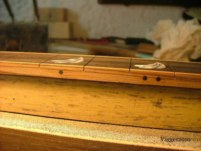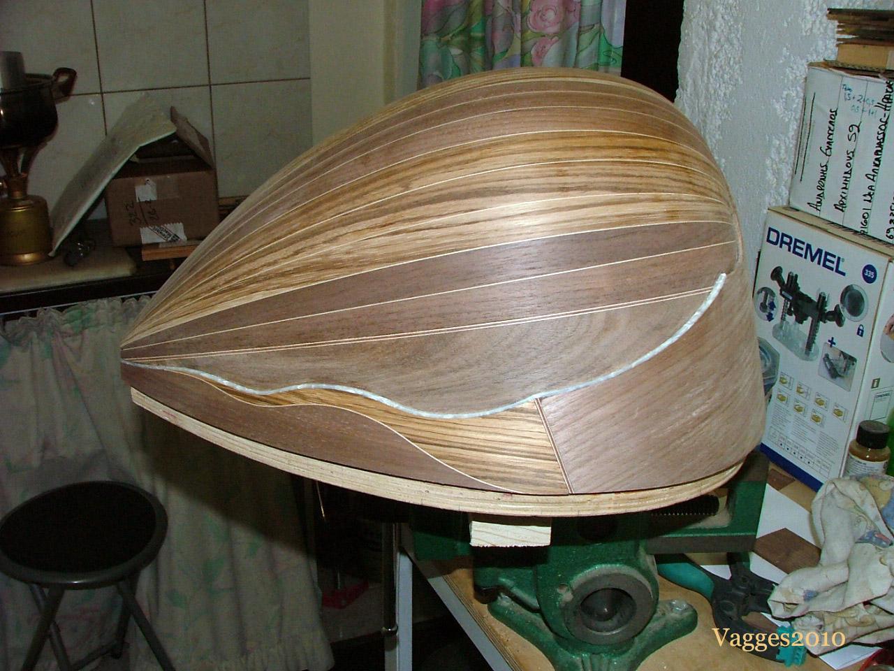 Σκάφος δίχρωμο Καρυδιά Αμερικής-Zebrano ανά τριάδες. Σύνολο ντουγών 19 αχάρακτες. Ενδιάμεσα στις ντούγιες φιλέτα καπλαμά κελεμπέκι