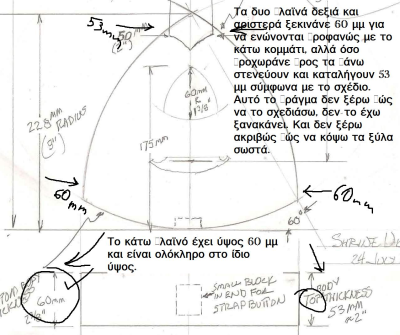 Παραθέτω τα σχέδια όπως τα βρήκα. Είναι ημιτελή το λιγότερο, και θέλω βοήθεια από κάποιον που γνωρίζει. Αρχικά για το πάχος των πλαϊνών , πώς να το υπολογίσω στο σημείο που θα στενεύει εκεί που θα ενώνεται με το λαιμό, αν μπορεί κάποιος να βοηθήσει με ένα σχεδιάκι. Αυτό βασικά και όποιος δει το σχέδιο και δει τι άλλο λείπει που θα με βοηθήσει από την εμπειρία του να το πει.