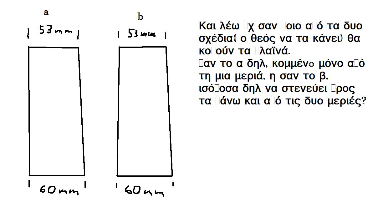 Και εγώ με αυτόν τον τρόπο σκόπευα να κάνω το λαιμό, και το σχέδιο σου ήταν πολύ βοηθητικό και οι φωτογραφίες, ευχαριστώ πολύ. Αλλά βασικά η απορεί μου γι αρχή είναι το ύψος του ξύλου των δυο πλαϊνών ξεκινά 60μμ και καταλήγει 53 μμ περίπου λέει στο σχέδιο και αυτό είναι για να πάρει σχήμα η πλάτη. Αυτό πως θα το υπολογίσω, και πως θα είναι μικρότερο? Ισόποσα και από τις 2 μεριές, μόνο από τη μια?. Βάζω και ένα σχέδιο στο περίπου για να το κάνω κατανοητό.