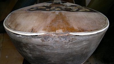 Σπύρο, έχει κάποια προβλήματα όπως ξεκόλημα καπακιού με κάποιο σκωροφάγωμα, κόλλημα ξεκολλημένων και ραγισμένων ντουγών,ράγισμα του καράολου στην κόλληση με το μάνικο και κάποια μικρή επέμβαση στη φιγούρα και στη ροζέτα. Από κει και πέρα κάποιο πολύ ελαφρύ ξύσιμο για να φύγουν κάποιες μικρές σκλήθρες στο σκάφος και στο καπάκι, ξαναβερνίκωμα κλπ.