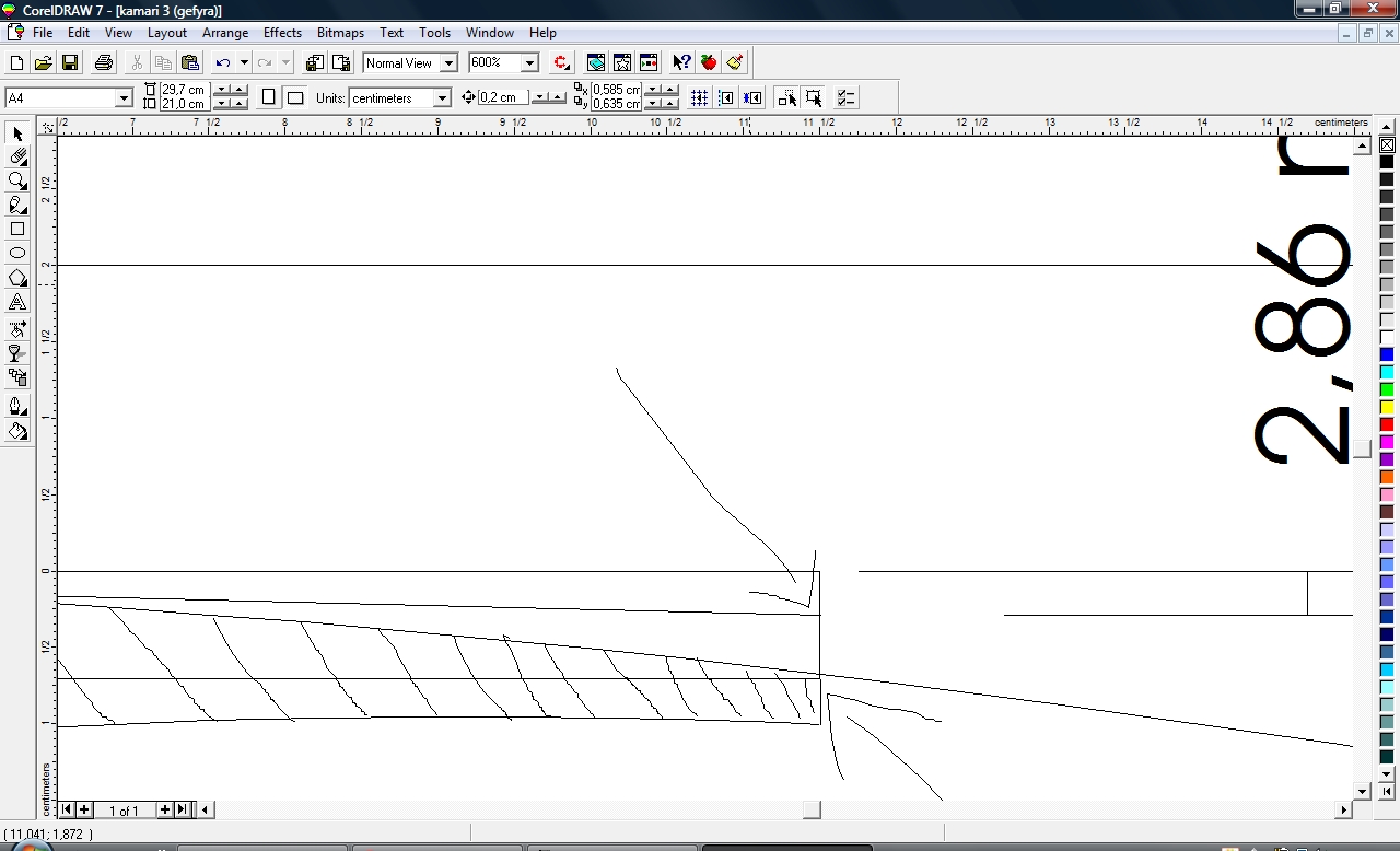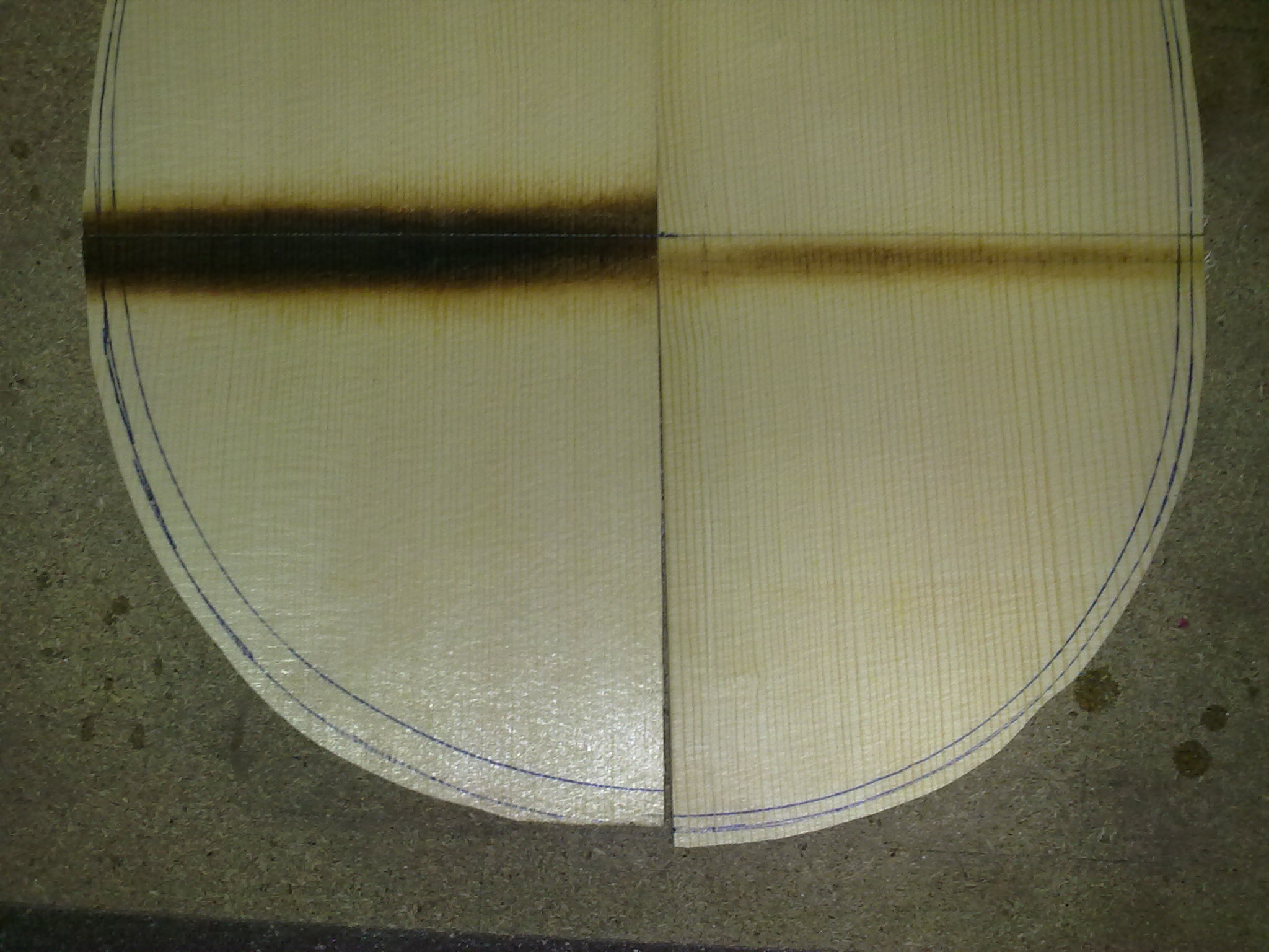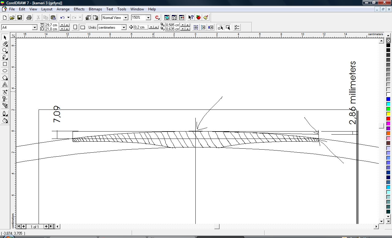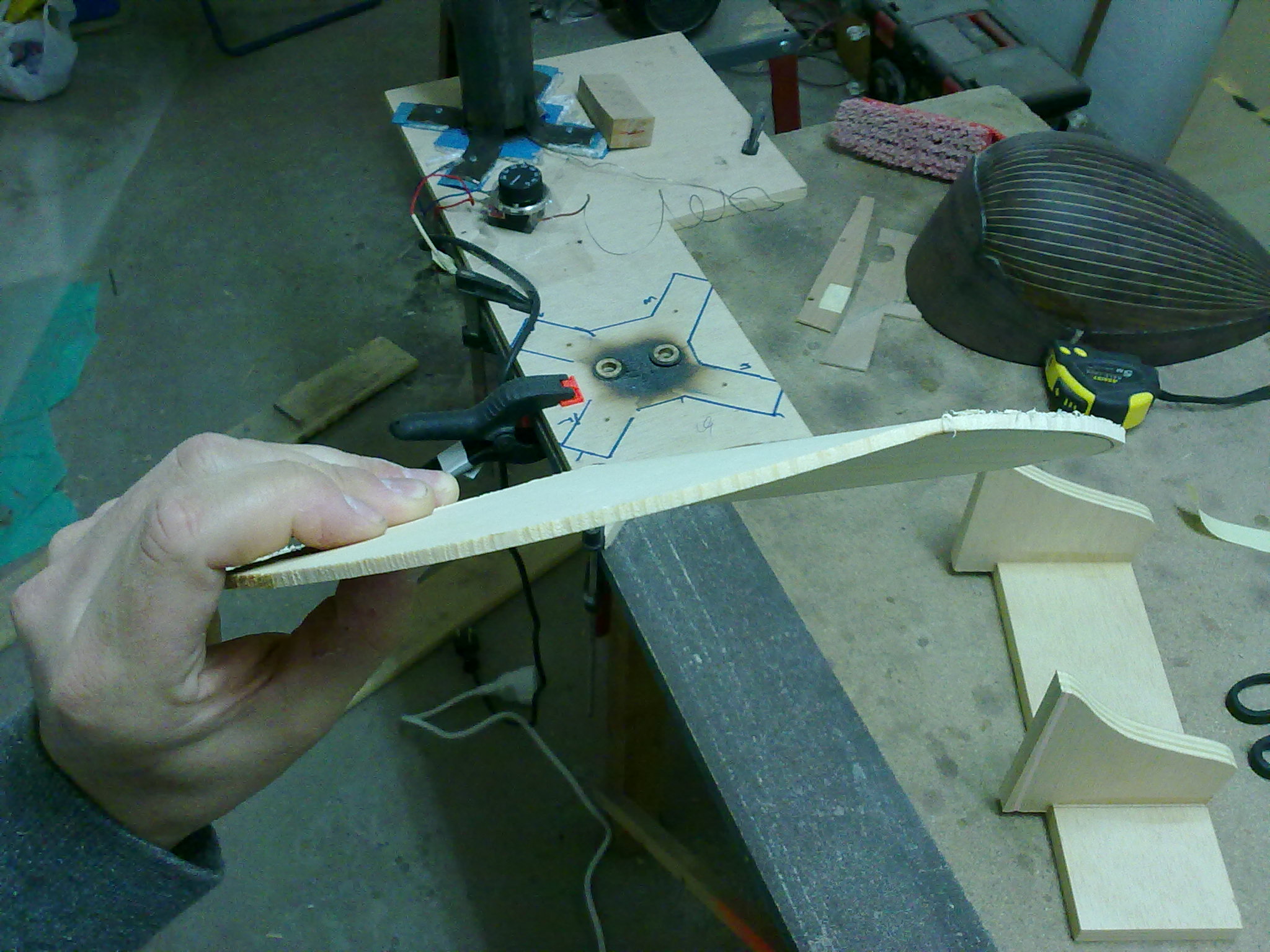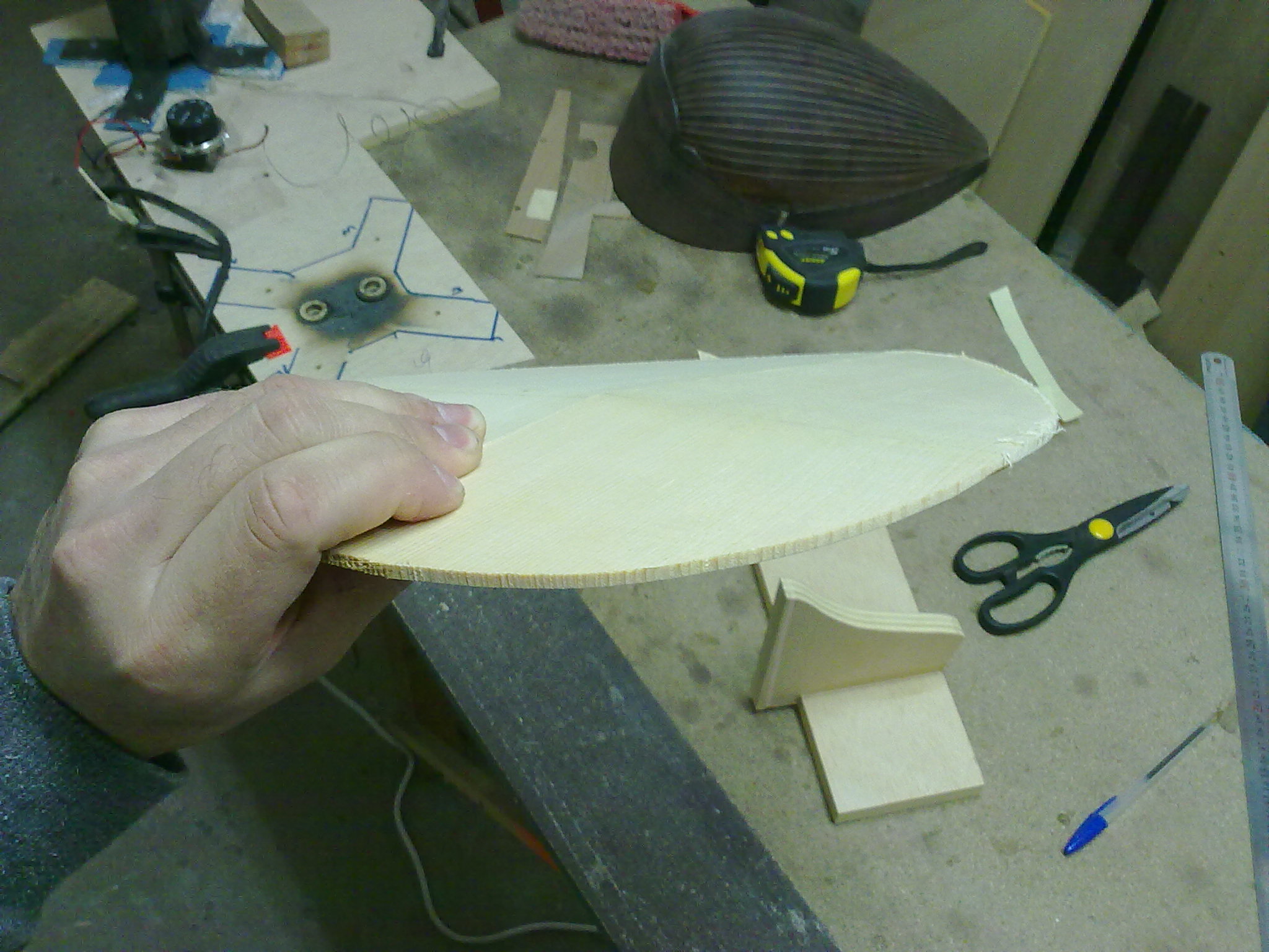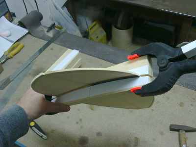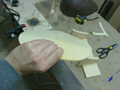 Φιλε Κουρος πολυ ωραιες ερωτησεις,λοιπον χωρις να γνωριζω ποια ειναι η απαντηση ακριβως,θα προσπαθησω να σου απαντησω βαση οσων εχω διαβασει απο διαφορες πηγες,βαση αντιληψης και βαση  πρακτικης εμπειριας μου απο ενα τετοιο καπακι μπαγλαμα που εκανα.Καταρχην να σου πω πως η φωτογραφια οπως ειναι τραβηγμενη ξεγελαει λιγο,δεν ειναι τοσο εντονη η κορυφη και η γωνια της διαμηκους κολλησεως   (δεν εχουν κολληθει ακομη) ,ειναι και ινες του ξυλου απο το τριψιμο που δεν εχω καθαρισει και φαινεται εντονη η γωνια.Λοιπον μετα την κολληση με ενα  απαλο τριψιμο απο πανω θα φυγει εν μερει.Τα καμαρια επισης θα βοηθησουν σ'αυτο,οπως και ενα "καλουπωμα" που θα κανω κολλωντας τα καμαρια.Αυτο που θα βοηθησει κυριως ειναι η διαμορφωση του σκαφους και ιδιαιτερα  στο πιο φαρδυ σημειο του καπακιου οπου  βρισκεται  η τσακιση και δυσκολα μπορει να καμπυλωθει εκει το καπακι  συν του οτι δεν θα υπαρχει εκει καμαρι για να του δωσει την καμπυλη.Η παρακατω  τρεις φωτο δειχνουν το σκεπτικο μου.Το καμαρι και η καμπυλοτητα του ,αναλογως και του καπακιου.Το ψηλοτερο σημειο του καμαριου απο το χαμηλοτερο σε αυτο το μηκος (23 εκατοστα) απεχει 7mm (7,09 μου το δινει το προγραμμα).Στη μεγεθυμενη φωτο φαινεται που  ακριβως θα φτανει το καπακι ακριβως μετα την κολληση των δυο μισων χωρις καμια επεξεργασια,3mm απο το ψηλοτερο σημειο του (2,86  το δινει εδω).Απο κατω φαινεται το διαστημα που υπολειπεται ως που να φτασει στο σκαφος και ετσι να παρει μια καμπυλη.Αυτο ειναι ενα σημειο οπου θα υπαρξουν τασεις στο ξυλο γι'αυτο θα βραχει και θα καλουπωθει για να κολληθει το μεγαλο καμαρι και ισως χρειαστει να μεινει ετσι για καποιες μερες.Παρακατω στην αλλη φωτο σκευτηκα τον τροπο που θα το καλουπωσω και θα το πιεσω με σφικτηρες