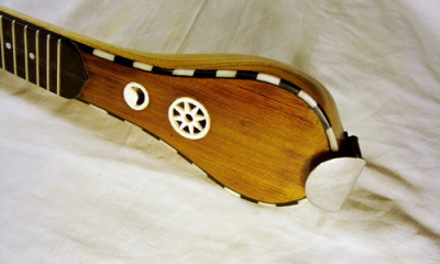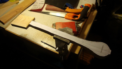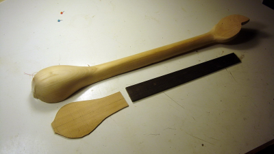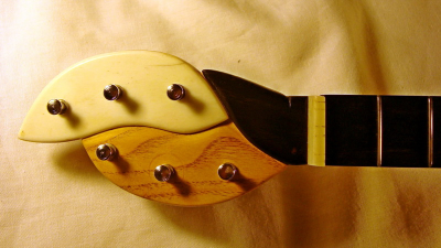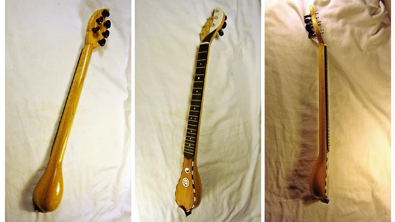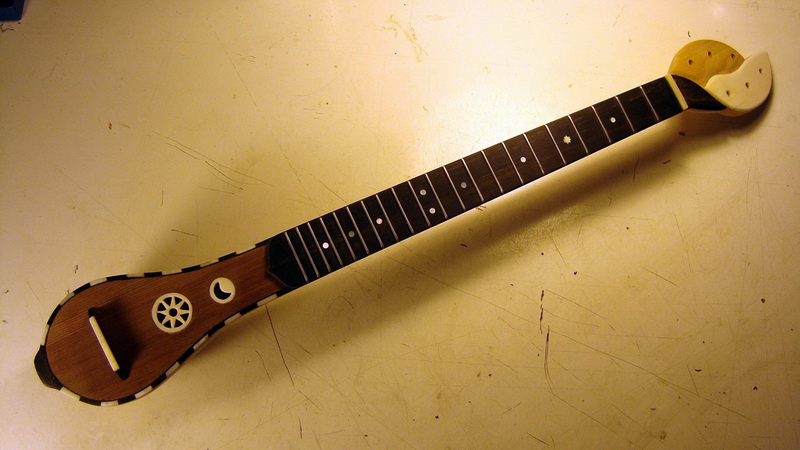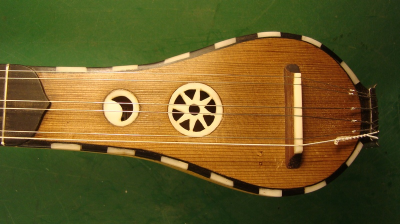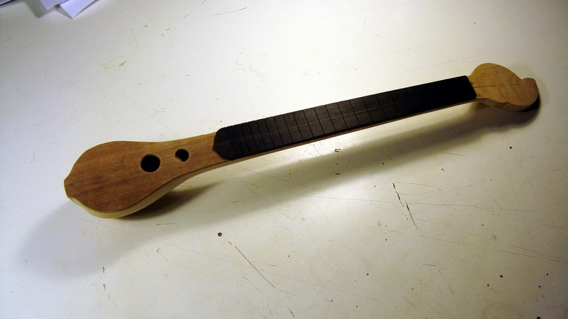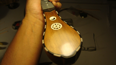 Κλίμακα 36, ολικό μήκος 51, σκάφος 6,5*11 εκ. Σώμα καστανιά, καπάκι κέδρος, ταστιέρα έβενος, διακόσμηση έβενος και κόκκαλο. Το φινίρισμα έγινε με γομαλάκα και με ικανοποίησε πολύ, αλλά τελικά - μετά από περιπέτειες που  αναφέρω παρακάτω – το πέρασα με CLOU 500 γιατί δεν μπορούσα να περιμένω τρίτη φορά την γομαλάκα να τραβήξει.