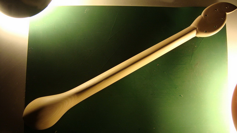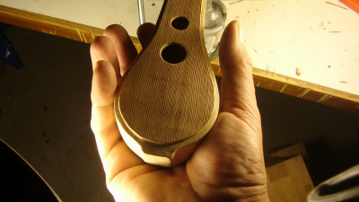 Αυτό έφερε αλλαγή στη γεωμετρία γενικά, εξηγώντας εν μέρει το λίγο φαρδύ μανίκι στην βάση που πρόσεξε ο Δημήτρης Ανδρέου. Επίσης άλλαξαν τα δεδομένα της «διακόσμησης» - λογικό αφού και μόνο η δεύτερη τρύπα αρκεί.  Αφού ήδη ο κέδρος με την καστανιά έχουν αντίστροφη σχέση απ’ ό,τι συνηθίζεται (σκούρο σκάφος – ανοιχτό καπάκι), μου φάνηκε λογική η συνέχεια των αντιθέσεων - σε χρώματα ή σχήματα ή και τα δύο –κι έτσι προέκυψαν οι ροζέτες «Ήλιος / Φεγγάρι», έβενος / κόκκαλο κτλ.  Ακολουθούν φωτογραφίες από διάφορα στάδια της κατασκευής: