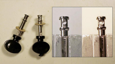 Επίσης ήθελα να αναφερθώ λίγο στα κλειδιά (για ukulele): είναι πολύ ελαφριά, κομψά, πάμφθηνα (1,60 το σετ και αποστολή δωρεάν), αλλά έχουν και σοβαρά μειονεκτήματα. Το πιο σπαστικό είναι το κούρδισμα, αυτά που βλέπετε  δεν έχουν μειωτήρα (γρανάζι), η παραμικρή στροφή του καρπού μεταδίδεται απευθείας στη χορδή (1:1) και το κούρδισμα γίνεται νευροχειρουργική επέμβαση. Απορώ τι χορδές έχουν τα ukulele. Επίσης δεν δουλεύουν χωρίς τις μεταλλικές ροδέλες (που ήλπιζα να αποφύγω). Τα συγκεκριμένα μάλιστα δεν είναι και καλής ποιότητας και στην αρχή μου έκοβαν συνέχεια τις χορδές, μέχρι που έκανα ένα ελαφρύ «φρεζάρισμα» στην τρύπα και σταμάτησαν. Αυτά για τα κλειδιά.