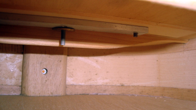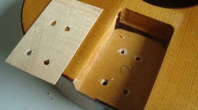 Αρχικά είπα να αλλάξω καβαλλάρη με άλλον παρόμοιο, με την ίδια στήριξη με τις βίδες. Μετά σκέφτηκα να δοκιμάσω floating καβαλάρη, για να δω τι θα γίνει άμα οι χορδές πιέζουν - αντί να τραβάνε - το καπάκι. Έβαλα έναν δεύτερο τάκο να πιάσω τον χορδοκράτη περαστό με βίδα από ήδη υφιστάμενη τρύπα (για το "καρφί" του ιμάντα για τον ώμο) ώστε να μην πληγώσω τα πλαϊνά αν δεν πετύχαινε το πείραμα....