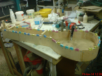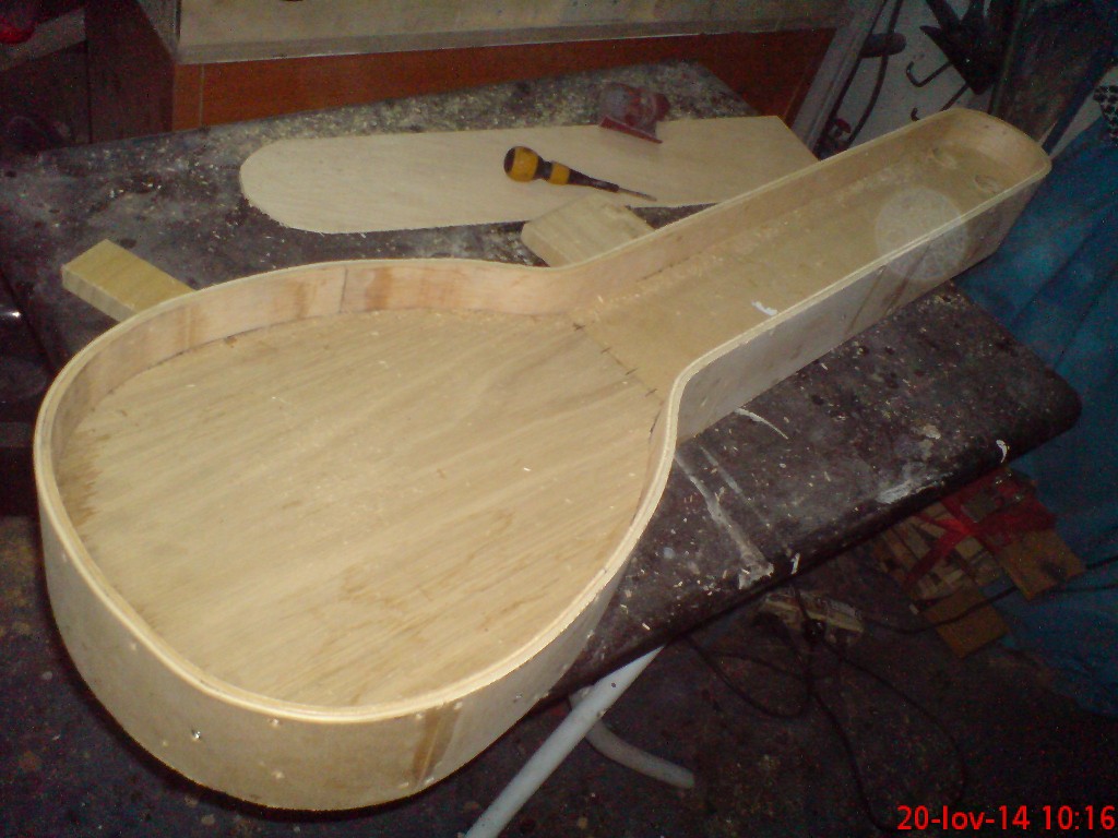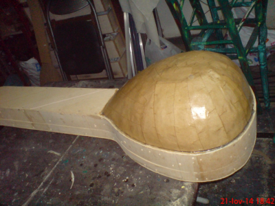 Γεια  σας  παιδια.   Αφου  τελειωσε  το  μπουζουκακι  μου  και  περιμενοντας  την  εκθεση  ειπα  να  κανω  μια  προσπαθεια  να  του φτιαξω  μια  θηκη. Εκανα  κάποιες  σκεψης και  ξεκίνησα  την  κατασκευη.Εφτιαξα  ενα  πατρον  απο  16  mdf  και  το  τυλιξα  2  φορες  με  10  ποντους  κοντρα  πλακε  4χιλ  κατόπιν το  εκλεισα  απο  την  μια  μερια  με  κοντρα  πλακε  και  απο  την  πισω  μονο  στο  μπρατσο.