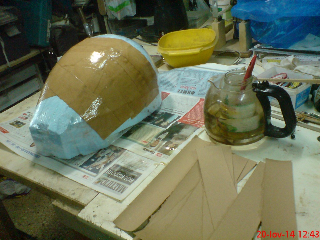 Μετα  απο  αυτο  το  εκοψα  στους  4  ποντους  για  το  καπακι.Το μερος  του  σκαφους  τογεμισα  με  φελιζολ  και  εδωσα  το  σχημα  μετα  κολησα με  ψαροκολλα  ψιλο  χαρτονι    και  εφημερίδα  για  να  παρω  το  σχημα   οταν  στεγνωση  θα  το  περασω  απο  μεσα  αλλα 3  χερια  χαρτονι .Τωρα  στο  ντυσιμο  με  δερματινη  θα  δουμε  πως  θα  γινει  παντος  ελπιζω  να  ειναι  ετοιμη  μεχρι  την  εκθεση