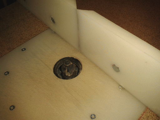 Από κάτω, η σανίδα έχει κοπεί με το ρούτερ και με σέγα για να φωλιάζει ο ρούτερ (τα ροδάκια είναι για άλλη χρήση της σανίδας - είπαμε ΔΕΝ έχω χώρο οπότε κοιτάζω μήπως και βολεύω καναδυό θέματα τη φορά). Στη βάση-πόδια στηρίζεται σφηνωτά με τις τέσσερις μεταλλικές γωνίες που φαίνονται στη φωτό: