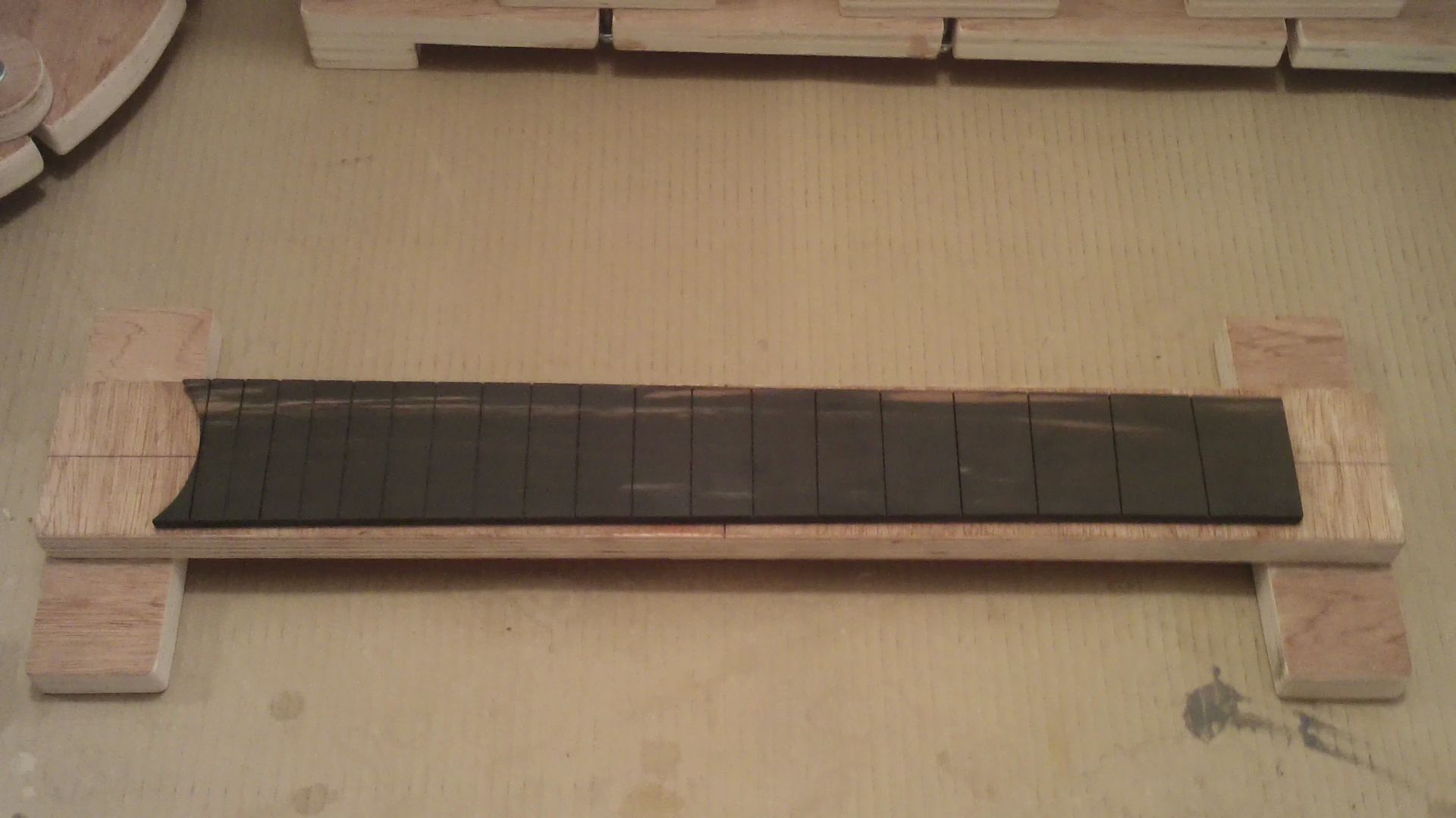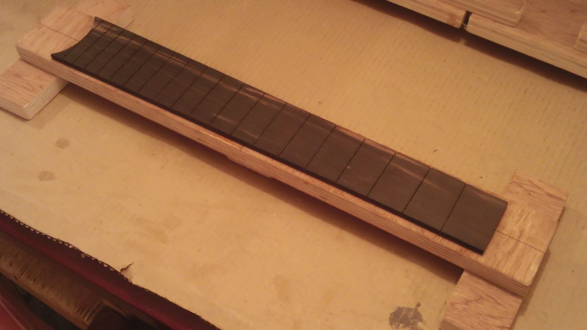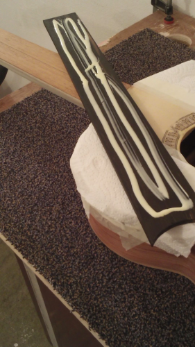οι εργασιες συνεχισθηκαν, με την ολοκληρωση του χαραγματος των ταστων, του χαρτοματος εκει που θα κολληθει η ταστιερα (για προστασια απο κολλες-βρωμιες κλπ.) και το κολλημα της ταστιερας, με κολλα μονον στην ταστιερα αφου χαραχθηκε για καλλιτερη προσφυση και οχι και στο αλλο ξυλο (μανικι) ΘΑΝΟ ΑΚΟΥΣ;