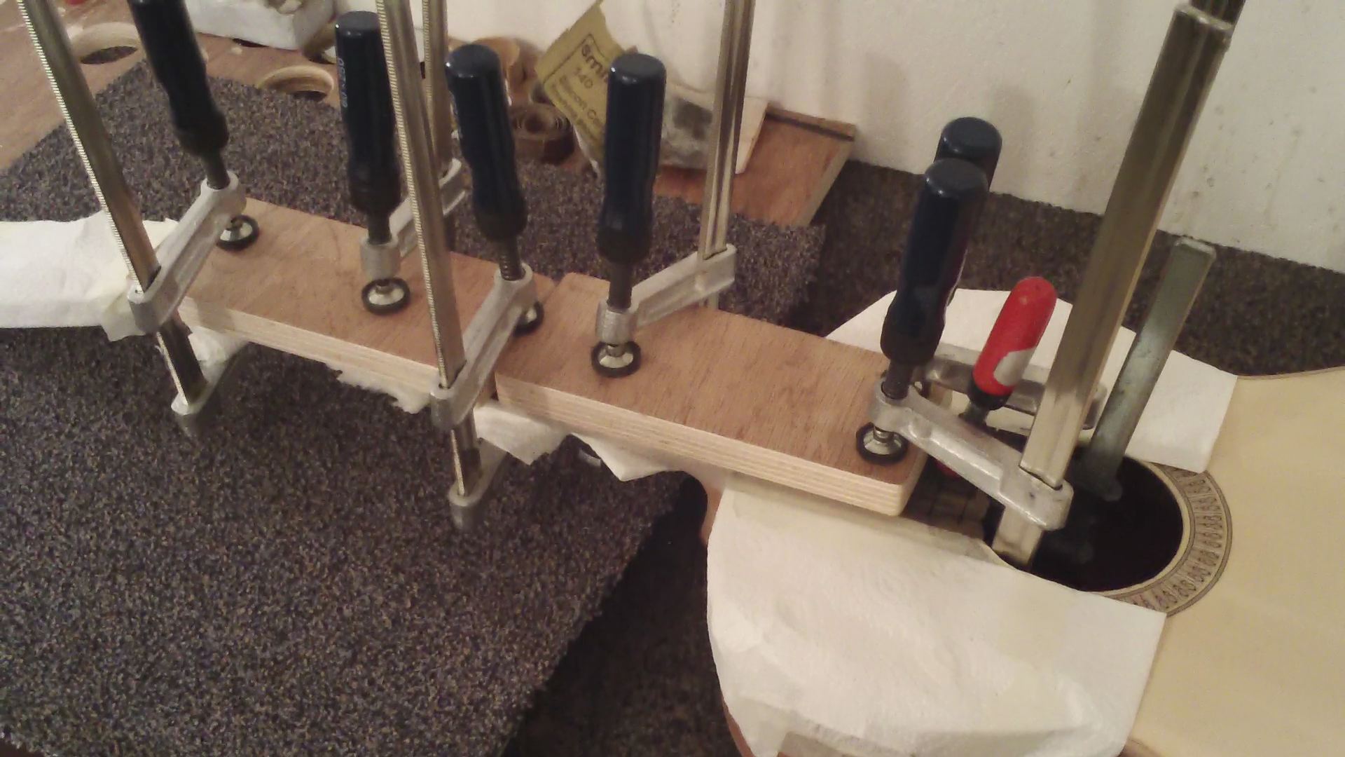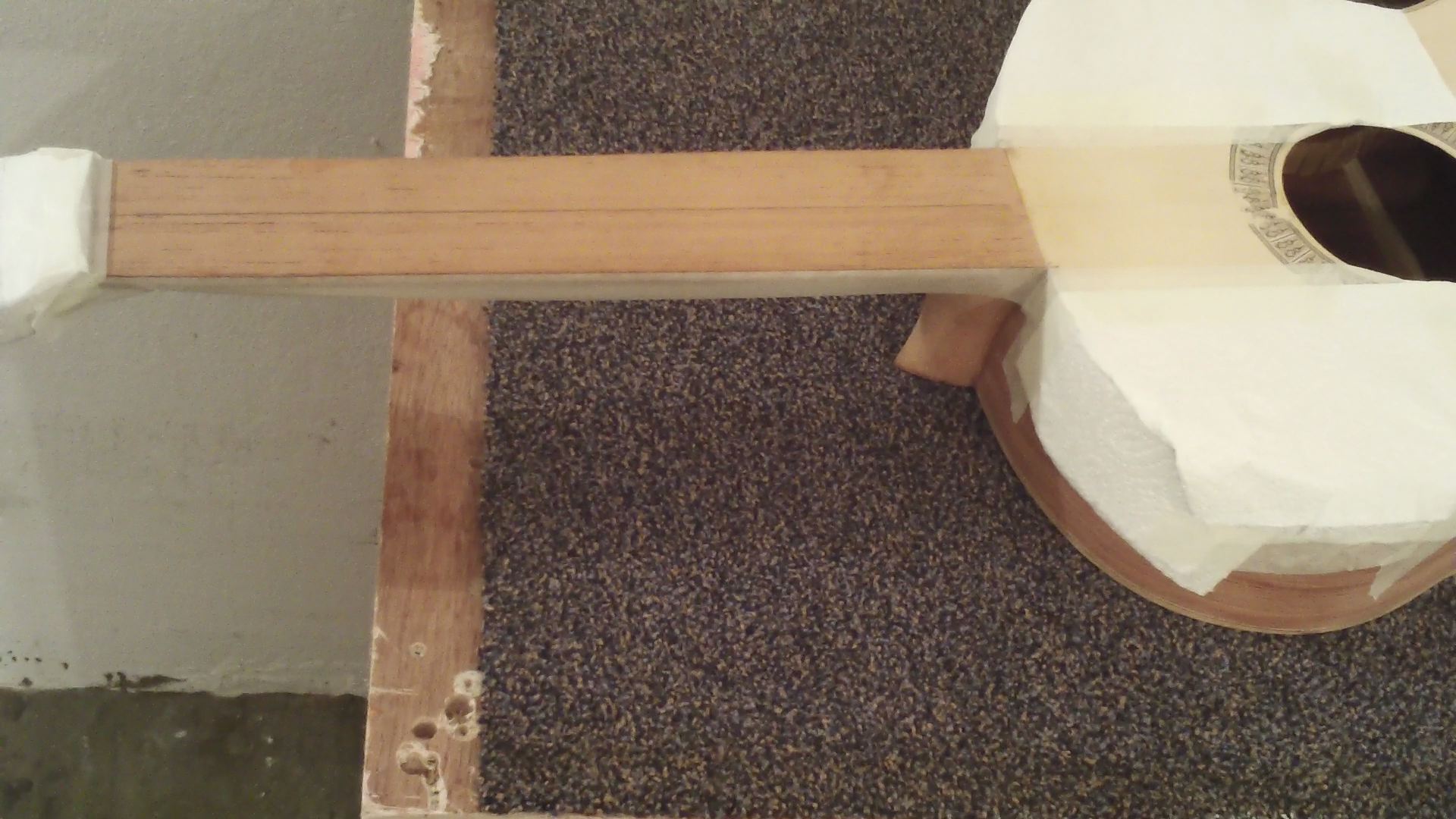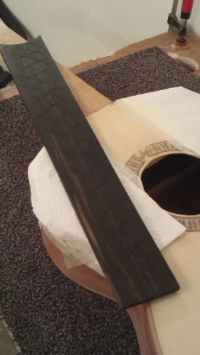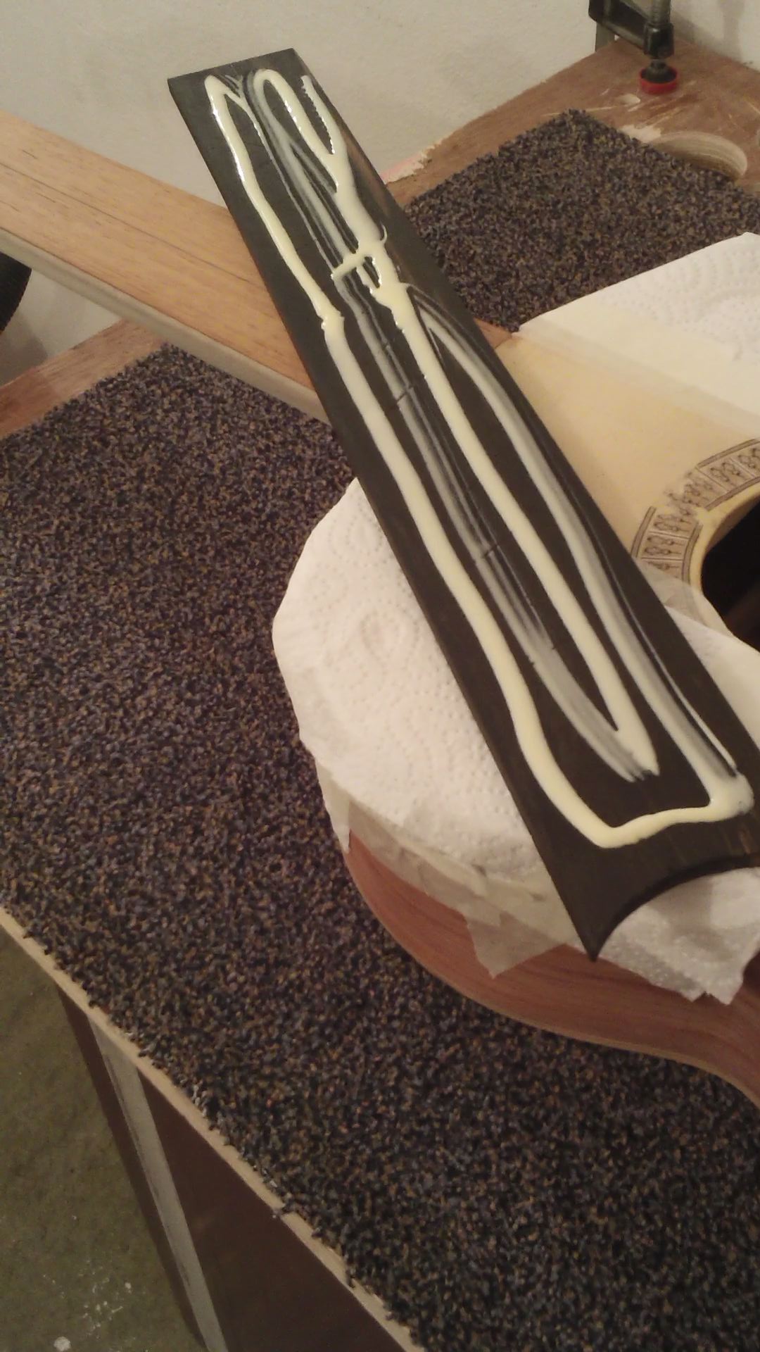 οι εργασιες συνεχισθηκαν, με την ολοκληρωση του χαραγματος των ταστων, του χαρτοματος εκει που θα κολληθει η ταστιερα (για προστασια απο κολλες-βρωμιες κλπ.) και το κολλημα της ταστιερας, με κολλα μονον στην ταστιερα αφου χαραχθηκε για καλλιτερη προσφυση και οχι και στο αλλο ξυλο (μανικι) ΘΑΝΟ ΑΚΟΥΣ;
