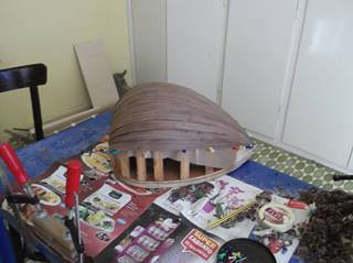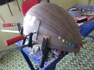 Mε αργα βήματα προχωράω το σκάφος, με ξυλο καρυδιά αμερικης. To εκανα με 19 δουγιες. Φιλετα όπως είπα δεν δοκίμασα να βάλω.Μιας και δεν χρησιμοποιώ φιλέτα ειπα να κολλησω τις δουγες μεταξύ τους με κολλα Titebond, φροντιζοντας να εχουν απολυτη επαφη μεταξυ τους. Το σκαφος δεν το χω τρίψει καθόλου ακόμη αλλά λόγω του οτι η κόλλα στεγνώνει αργα  και καθαρίζεται με νερό, δεν εχει λερώσει με περίσσιες κόλλες πολύ. Καποιες δούγιες μου είναι ανισόπαχες σε καποια σημεία. Σε μια περιοχη ηταν 2.9mm και σε καποια αλλη εφταναν μεχρι και 3.8mm , με αποτελεσμα να εχω μικρα σκαλοπατακια που θα εξαφανιστουν με το τριψιμο.