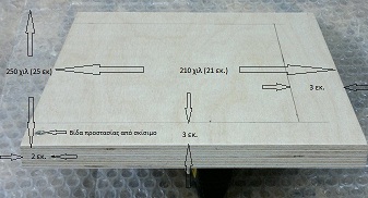 Κατ’ αρχάς κόβουμε και γωνιάζουμε προσεκτικά το κόντρα πλακέ στις προαναφερόμενες διαστάσεις που πιστεύω ότι είναι αρκετές για να παχυμετρήσουμε μέχρι και σκάφη μπουζουκιού.