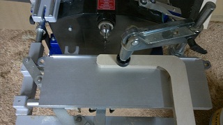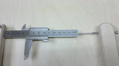 Κόβουμε το βυθομέτρη (σύρμα βυθομέτρησης) του παχύμετρου κατά 4 εκ. Τοποθετούμε κάθετα το παχύμετρο μέσα στην τομή (η έξω σιαγόνα να πατήσει πλήρως εξωτερικά του ποδιού), μετακινώντας το μπρος-πίσω μέσα στη τομή ώστε κατεβάζοντας το βυθομέτρη, το παχύμετρο να παραμένει κάθετο αλλά και ο βυθομέτρης να ακουμπάει στην άκρη της βίδας Μ4. Εάν η τομή και η τρύπα έγιναν στο μέσο του σόκορου θα έρθει ακριβώς, αλλοιώς θα πρέπει να το «φέρουμε» βάζοντας μέσα στη σχισμή διπλωμένα χαρτάκια. Το σταθεροποιούμε βιδώνοντας τις βίδες σύνδεσης ντουλαπιών (αφού τις κόψουμε στο κατάλληλο μέγεθος ώστε να σφίγγουν πάχος 18 χιλ). Αν το σφίξουμε βιδώνοντας νοβοπανόβιδες, προσέχουμε να τις σφίξουμε τόσο ώστε να σταθεροποιήσουν το παχύμετρο αλλά και να μην «κλωτσήσουν».