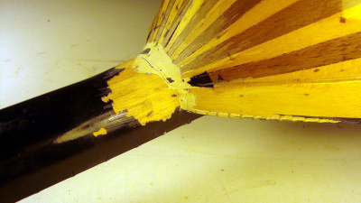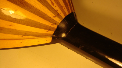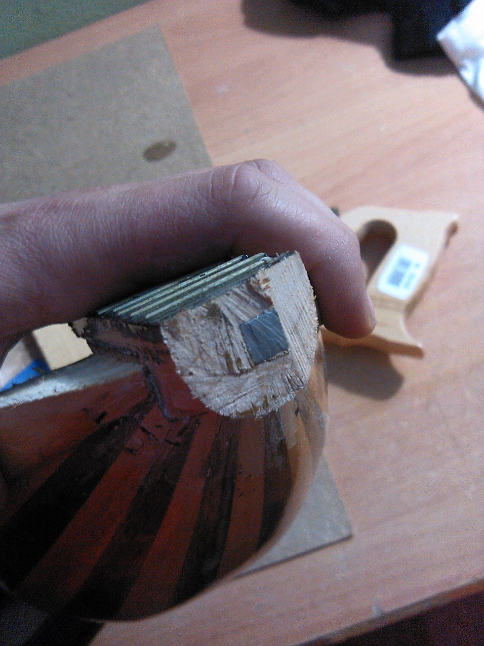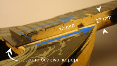 η άσπρη κουκκίδα σε σχήμα μισοφέγγαρου στο πίσω μέρος του μπράτσου (στο ύψος του 3ου-4ου τάστου) είναι στόκος στην ένωση του κομματιού που καλύπτει το αυλάκι της βέργας με το μάνικο, στο οποίο αφέθηκε στρογγυλή η απόληξη του κοντυλιού  (φαίνεται και μια μικρή διαφορά στο χρώμα προς την ένωση με το σκάφος).
