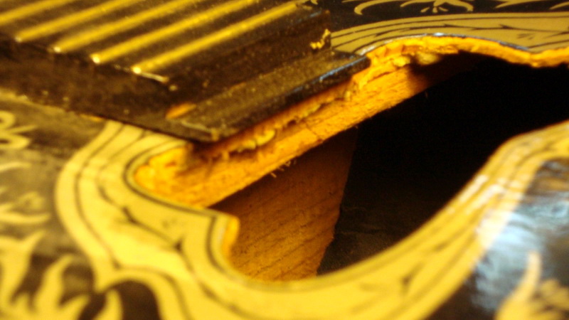 Οπως φαίνεται στην τελευταία φωτογραφία, η "ταστιέρα" είναι 10 χλστ. ενω όλο το μπράτσο 27 στην ένωση, πράγμα το οποίο με αποτρέπει καταρχάς από το να σκεφτώ νέα "κανονική" ταστιέρα, φοβούμενος το πάχος του μπράτσου που θα μείνει, ειδικά αν όντως είναι οξιά. Το δε καπάκι είναι κομμένο σε σχήμα ανάποδου "Π" και έχει μπεί συρταρωτά κάτω από την "ταστιέρα" μετά την τοποθέτηση του μπράτσου (φαίνεται η σχισμή όπου τελειώνει το "Π", καθώς και τα τελειώματα του καπακιού εκατέρωθεν της "ταστιέρας").