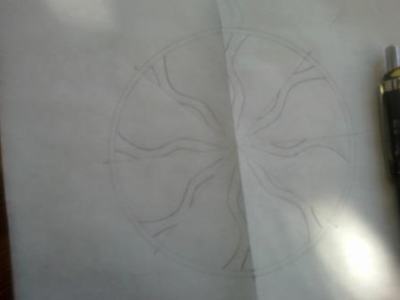 Στο ειδικο χαρτι που λεγαμε σε άλλο θεμα... σχηματισα τον ιδιο κυκλο με τις ωκτο ακτινες. Το τοποθετησα πανω στον αρχικο σχεδιο, ετσι ώστε να συμπιπτουν μεταξυ τους. Αφου πρωτα διαλεξα ποια απο τις δυο πλευρες του σχεδιου μου είναι πιο καλα σχηματισμενη, την αντεγραψα στο ημιδιαφανο χαρτι. Το ιδιο εκανα και στις υπολοιπες ακτινες περιστρέφοντας μονο το ένα χαρτι κατά μια θεση κάθε φορα, και αφου παντα τσεκαριζα ότι συμπιπτουν ολες οι ακτινες μεταξυ τους. Ετσι φτασαμε εδώ