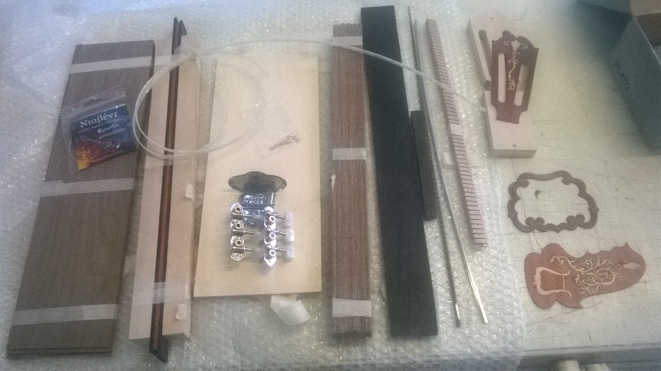 Ξυλεια για σκαφος απο καρυδια, καπακι ελατο, ταστιερα εβενο, κοντρες εβενο παντουκ και φλαμουρι για μανικι, εσωτερικη πατουρα, φιλετα περιμετρικα, εξωτερικο φιλετο απο celluloid, ροζετα φιγουρα καπακιου και διακοσμητικο καραολου κομμενα σε λειζερ, διαμορφωμενο καραολο, ξυλο για καβαλαρη, χορδιερα, κλειδια, χορδες, ταστα, dots για την ταστιερα. Ε απλα το μεγαλυτερο.....