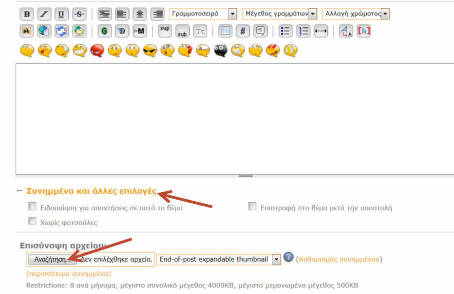 Φωτογραφίες αναβαζεις πατώντας  το λινκ συνημμένα και άλλες επιλογές, και μετα πας ? αναζήτηση για να επιλεξεις το αρχείο. Δίπλα με την επιλογή "end of post" ή inline... ορίζεις αν συμπεριλαμβάνεται μεσα στο μήνυμα ή απο κάτω ως συνημένο