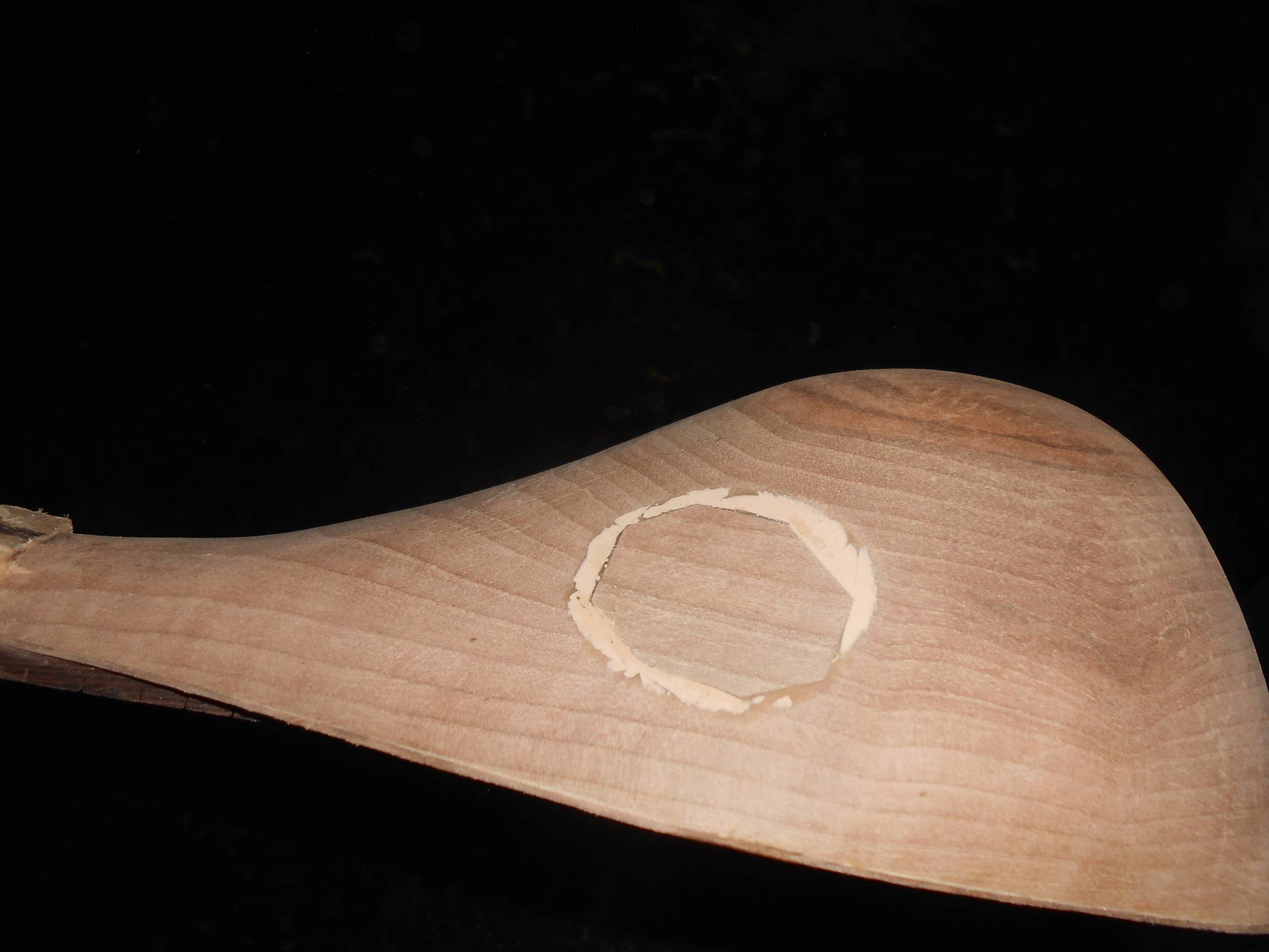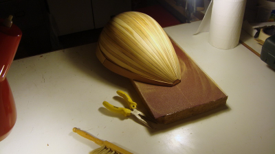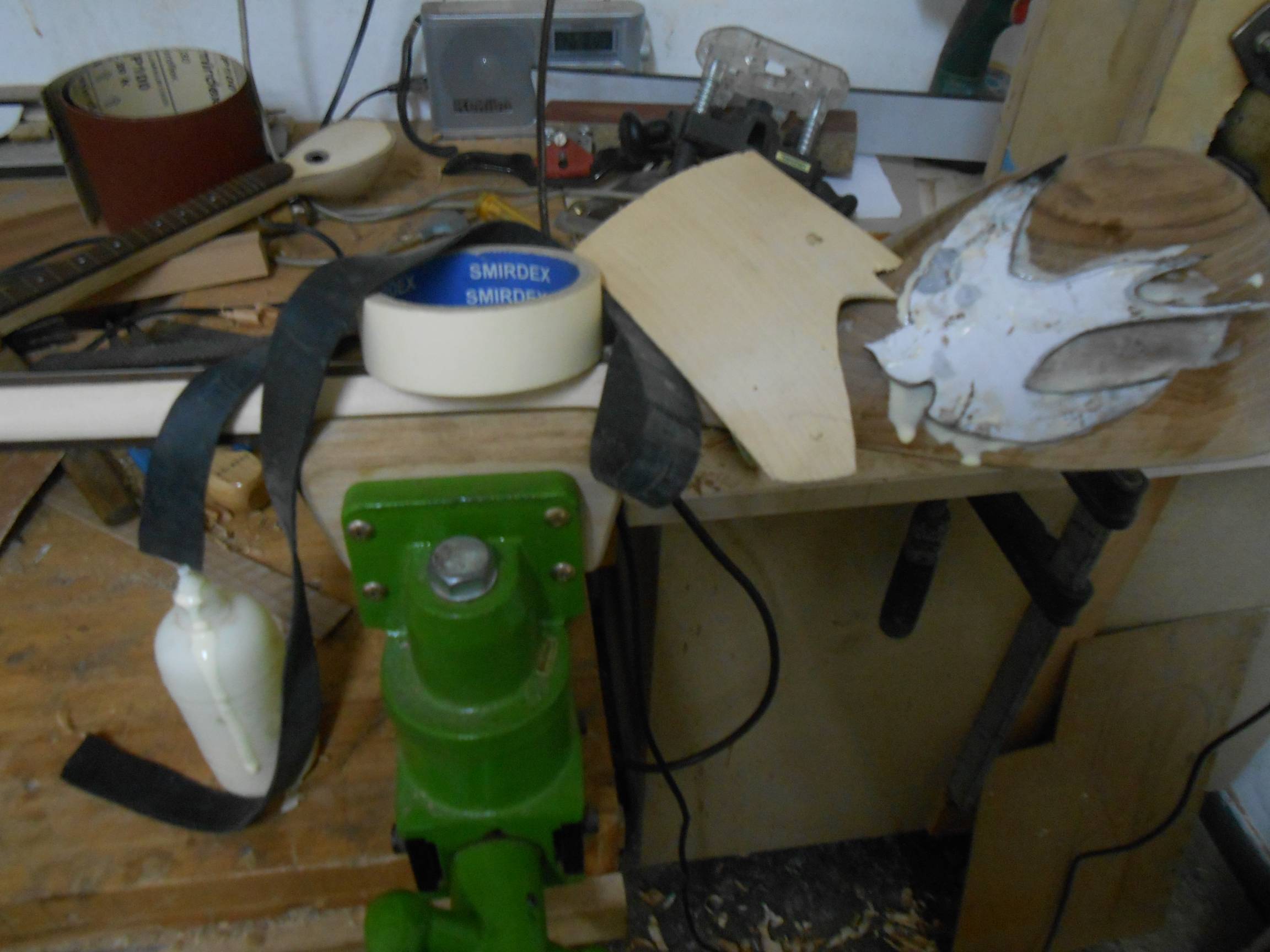 Το αποτέλεσμα ήταν να κάνει γύρω-γύρω βαθούλωμα(εκεί που βλέπετε τον στόκο)και αυτό συνέβη από την υπερβολική πίεση,έτσι το έτριψα, το στόκαρα,και έκοψα έναν έβενο που έιχα ένα κομάτι(πάχος 2 χιλιοστά),το σχέδιο είναι ένα χελιδόνι,ντάξει να πούμαι έτσι φένεται τουλάχιστον σαν περίγραμμα,έτσι λοιπόν το σχέδιο κόπηκε,λυγίστηκε,έσπασε(ένα κομάτι της ουράς),λυγίστηκε και ένα κελεμπέκι για να χρησιμοποιηθεί ως τάκος για σφίξιμο,και ακολούθησε,επάλειψη(πασάλειψη)κόλλας,σταθεροποίηση με χατοταινίες,και σφίξιμο γερό με λωρίδεςσαμπρέλας (2-2,5 εκατοστών φάρδος).