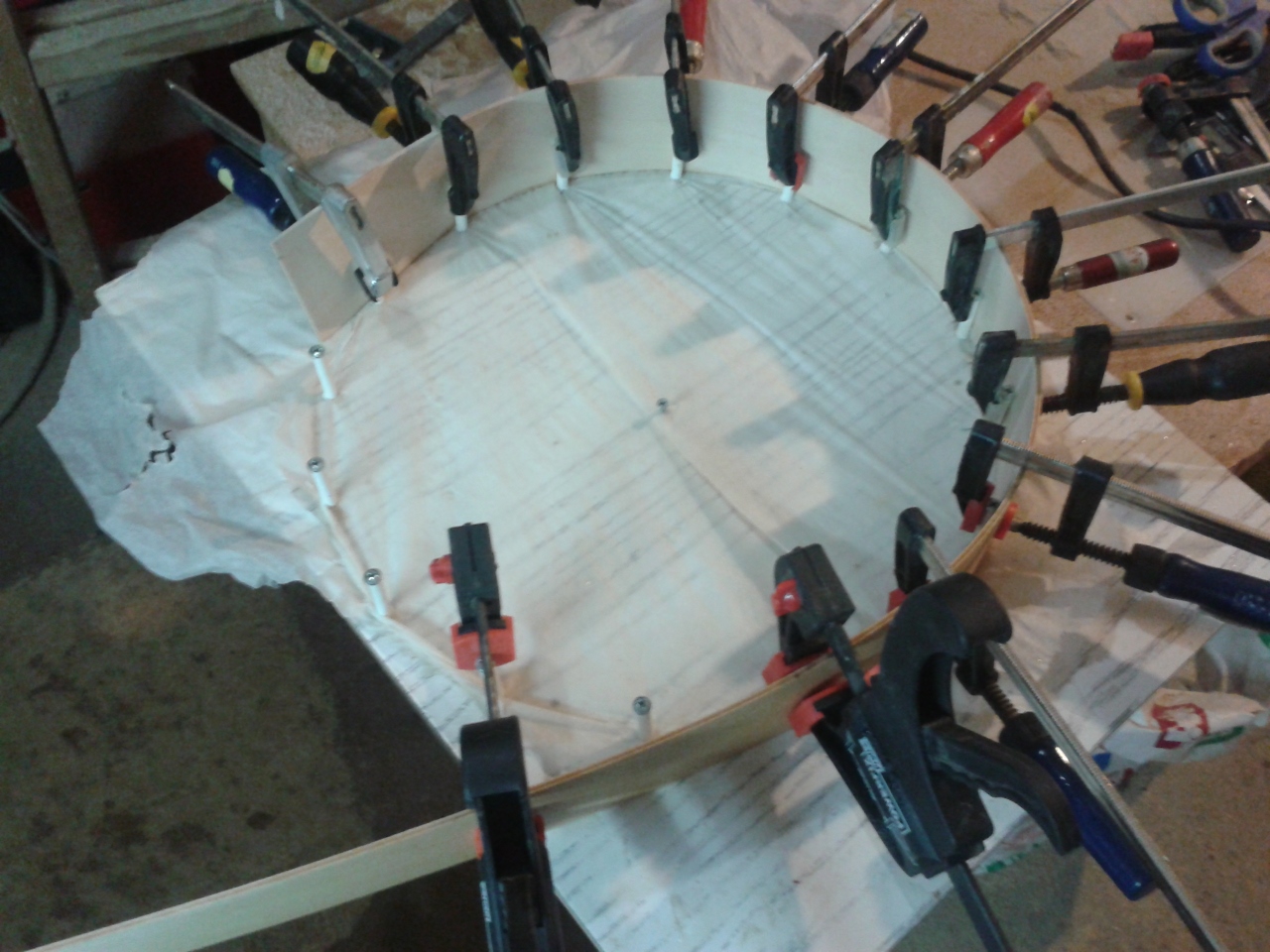 Λύγισμα 3χιλ. κόντρα πλακέ με νερό και σφικτήρες πάνω σε βάση από MDF και βίδες κυκλικά τοποθετημένες σε διάμετρο 14"