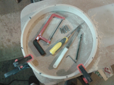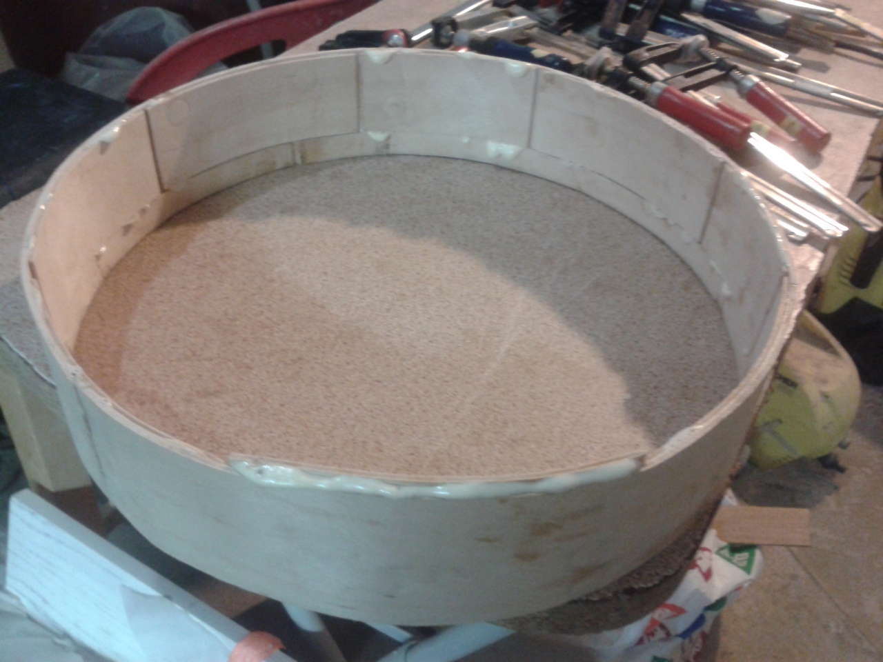 Αφού κωλύθηκε εσωτερικά και η τρίτη στρώση κόντρα πλακέ, χωρίστηκε με πριόνι το κινητό στεφάνι. Οι τρύπες ανοίχθηκαν διαμπερείς και πέρασαν από μέσα σκουληκόβιδες με τετράγωνο παξιμάδι που σπρώχνουν το στεφάνι, ώστε να τεντώνει το δέρμα.
