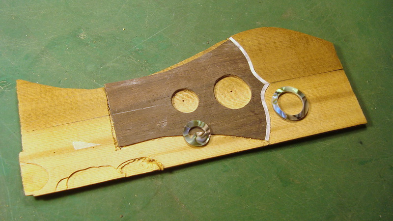 Το headstock είναι μπροστά έβενος με καπλαμά κελεμπέκι και πίσω κελεμπέκι μουαρέ με καπλαμά έβενο.