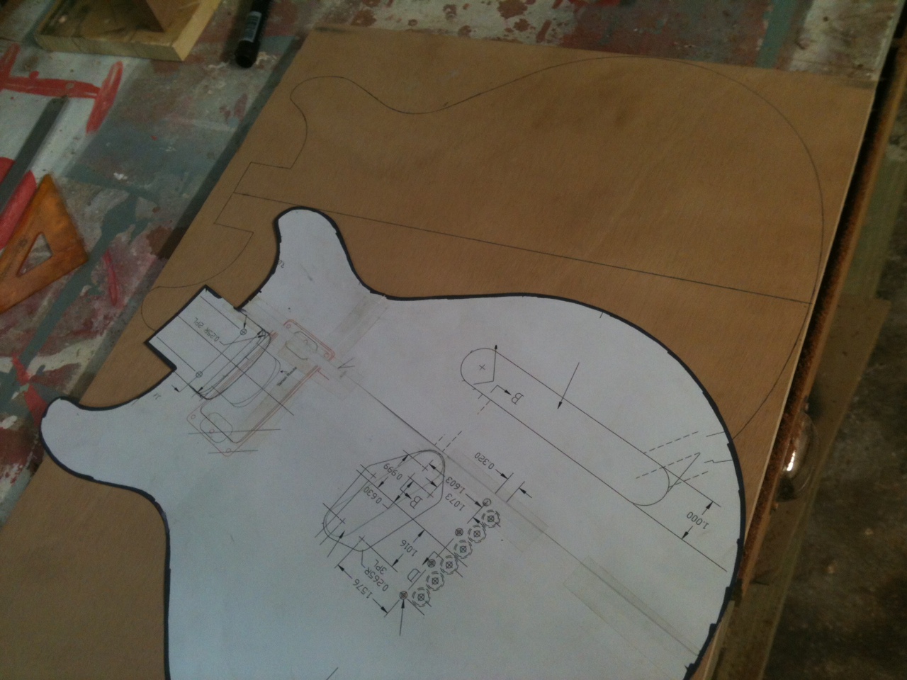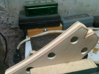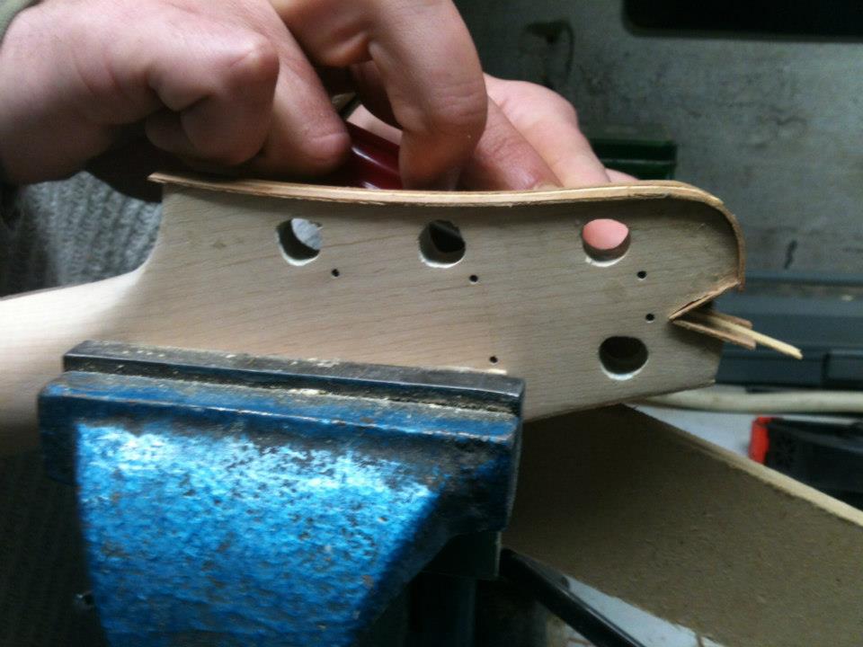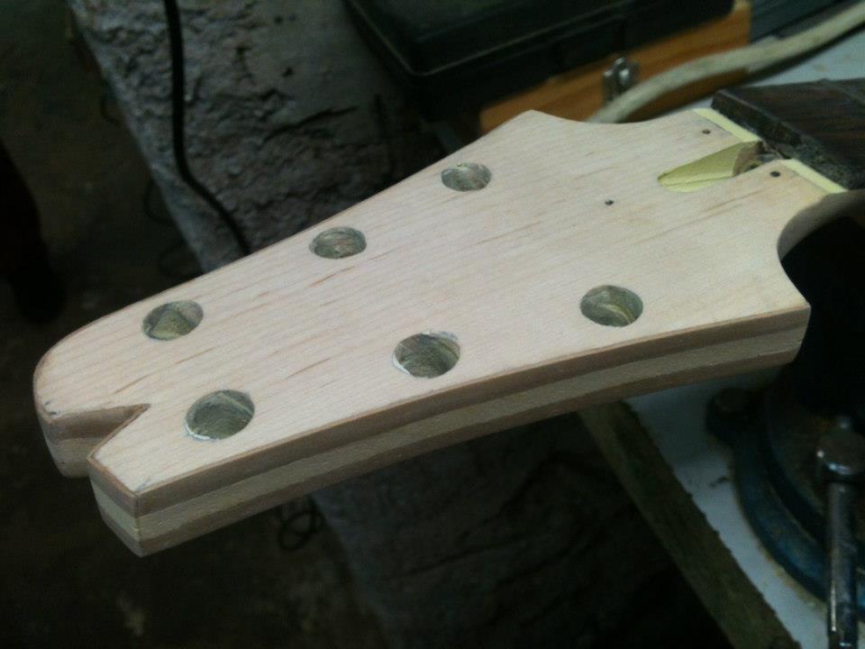 αλλα ειπα να ξεκινησω με το μπρατσο πρωτα...κι αφου ετριψα για ωρες τις ατελειωτες στρωσεις απο χρωμα... ;D (μα καλα, τι ειχα στο μυαλο μου???) προσθεσα καποια φιλετα για να διορθωσω το σχημα του headstock...η παλια εκδοση ειχε στοκο... ;D
