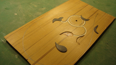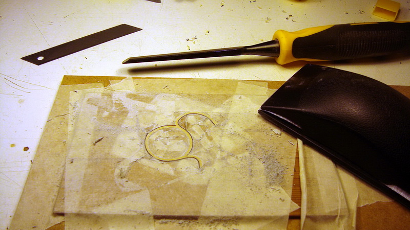 επειδή με πιάνει αυτό το "κακό" που βαριέμαι το ίδιο πράμα δυο φορές, παιδεύτηκα με νέα διακόσμηση: αποφάσισα να φτιάξω αυτό το εξ' ολοκλήρου "γραμμικό" ένθετο. Το σκάψιμο ήταν πιο εύκολο απ' ό,τι φανταζόμουν, αλλά δεν βρήκα στην ντόπια αγορά τα πλαστικά φιλέτα 2mm με τα οποία είχα κάνει τις δοκιμές μου - δυστυχώς αφού είχα σκάψει το καπάκι.