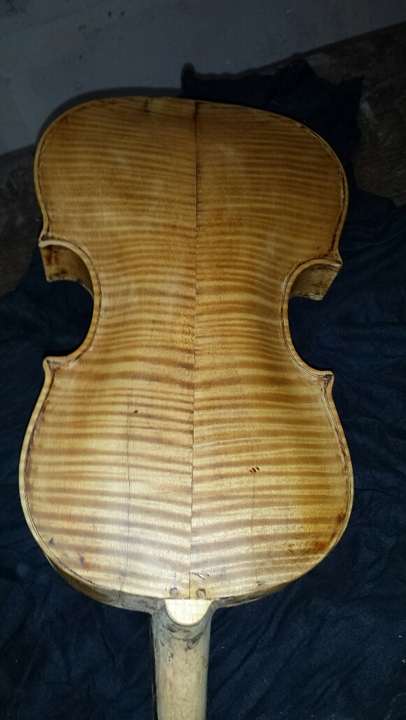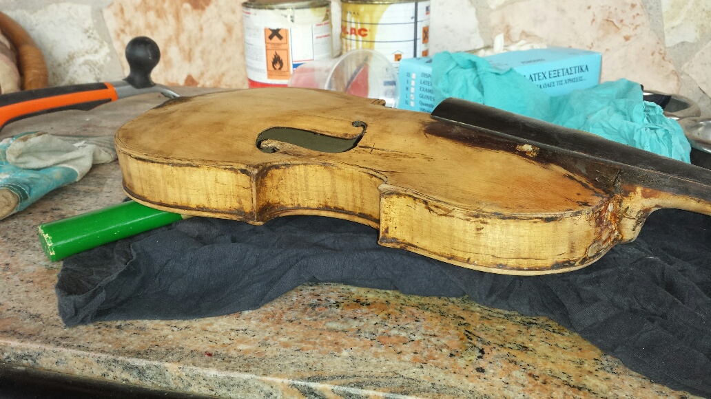 Ένας φίλος από Σαντορίνη μου έστειλε ένα παλιό βιολί σε κακά χάλια, μήπως καταφέρω να το σώσω γιατί έχει συναισθηματική αξία.Σπασμένο μπράτσο,σπασμένο καράολο, περασμένο με 3 κiλά λαδομπογιά, τρύπες κλειδιών ξεχειλωμένες κτλ.Ολο το όργανο ήταν βαμμένο με το χρώμα που υπάρχει στο καράολο.