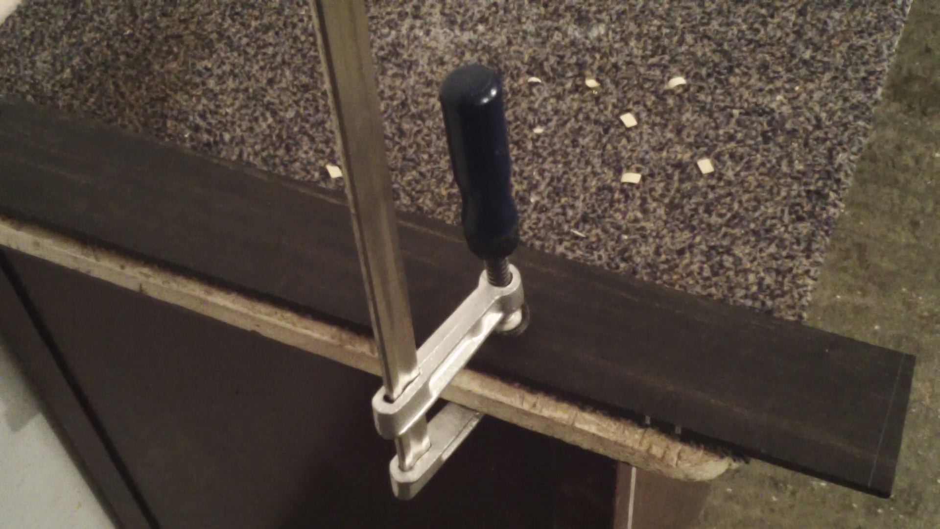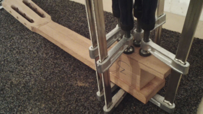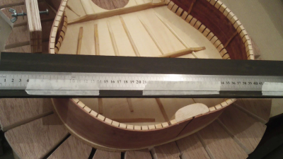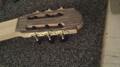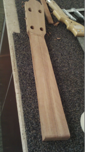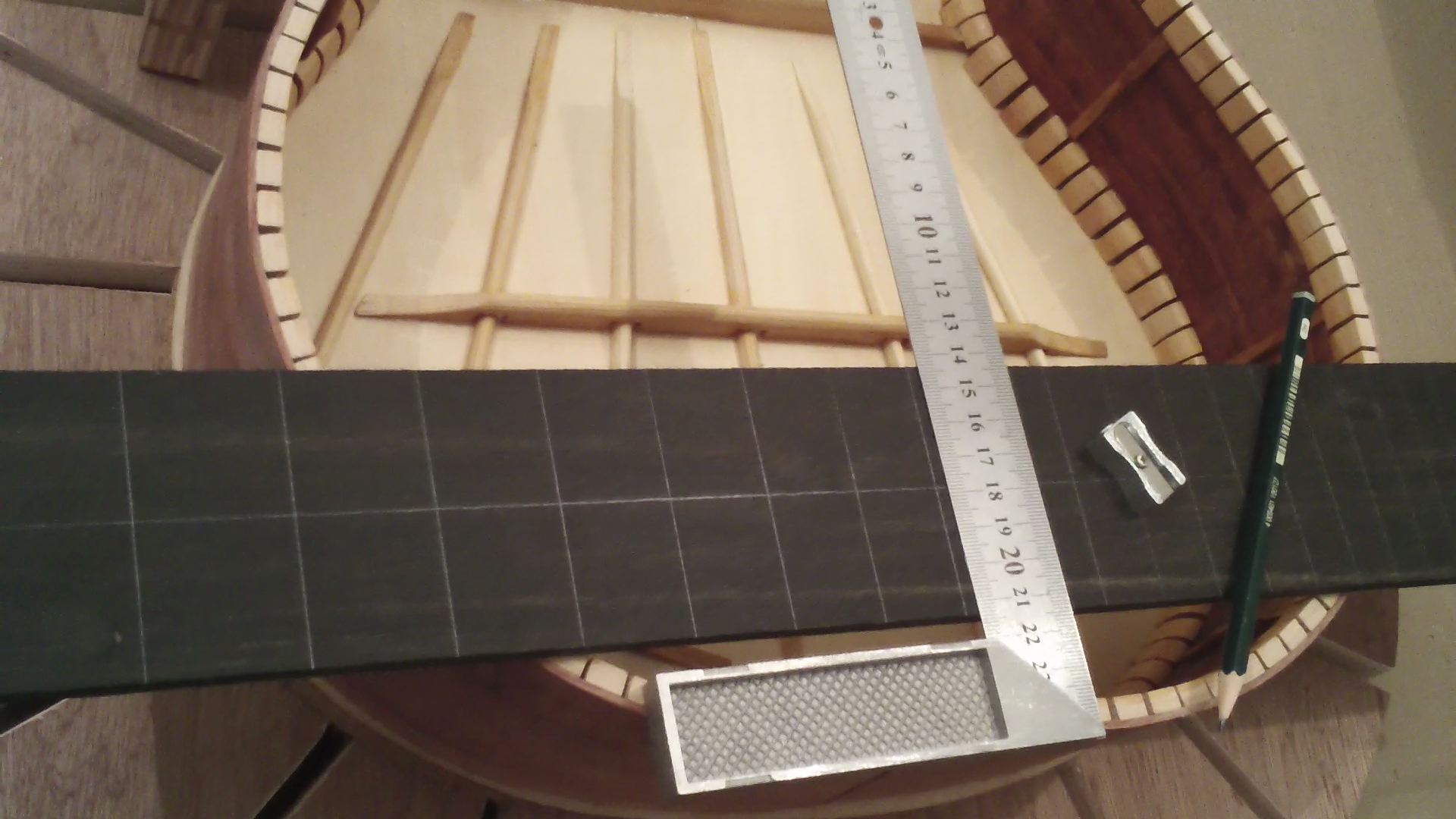 σχεδιασμος-κοψιμο τακουνιου, κολληση με το μπρατσο, γωνιασμα ταστιερας (εβενος στα 6 χιλ), σημαδεμα για κλιμακα 65 με σκληρο μολυβι, και προετοιμασια για χαρακιες...