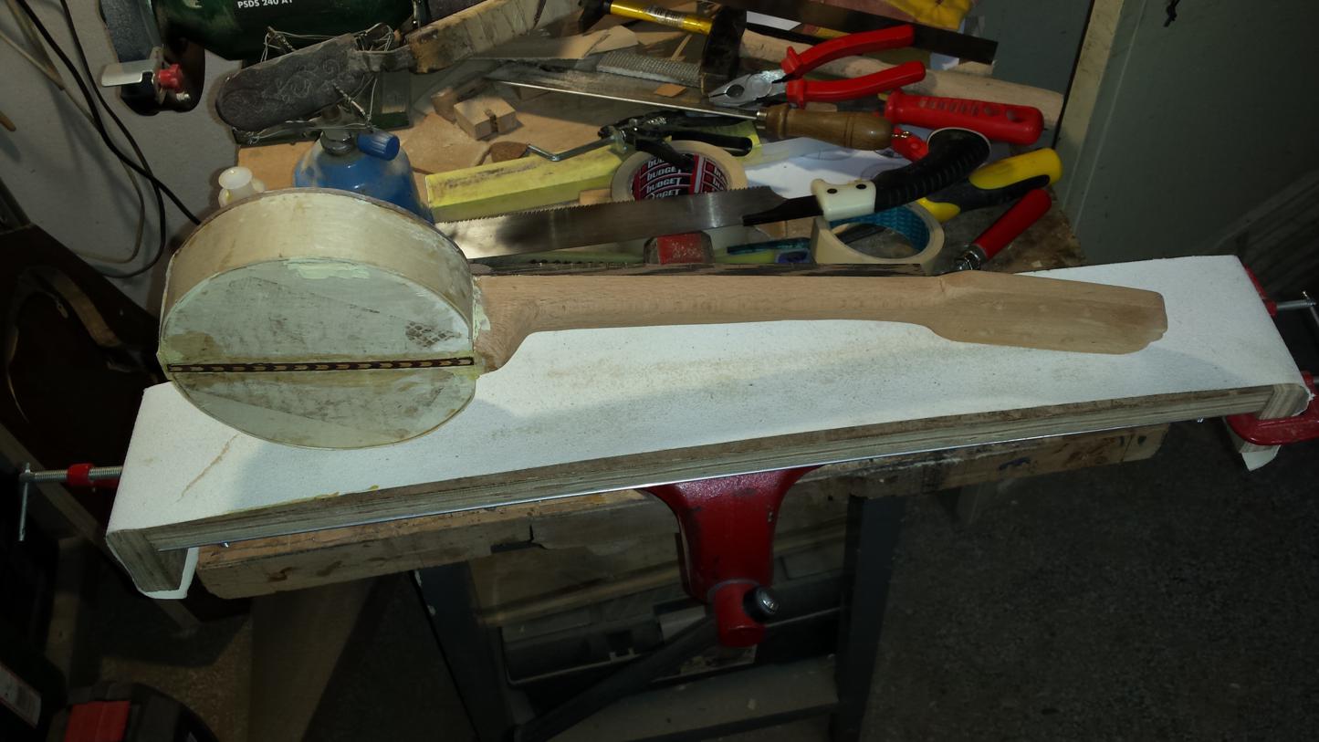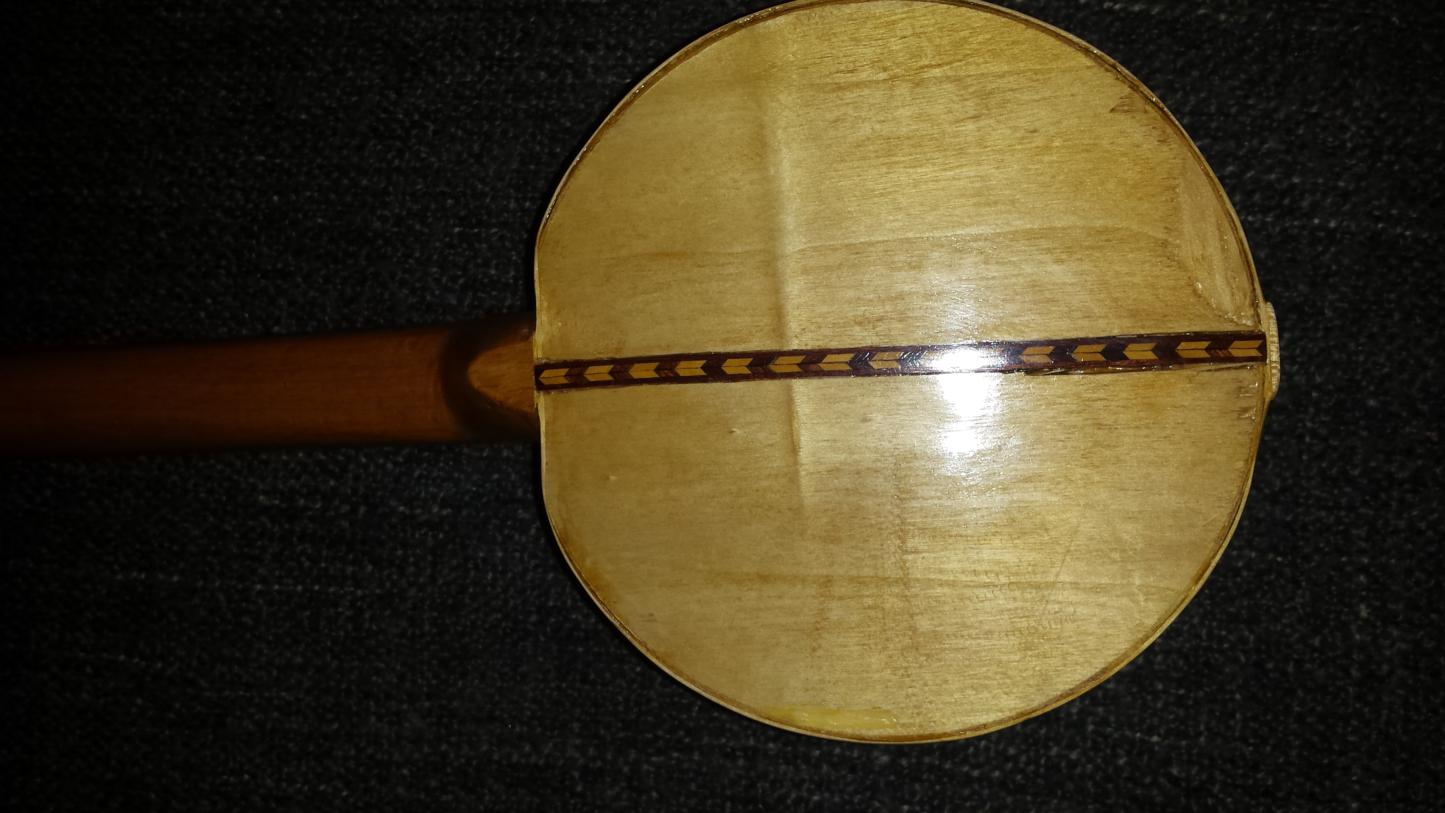 Το μάνικο έγινε από οξιά – πόδι από ένα πολύ παλιό τραπέζι τραπέζι του πεθερού μου μπορεί και πάνω από σαράντα χρονών. Χρησιμοποιηθήκε τεχνική με τακάκι όπως στις κιθάρες  για μεγαλύτερη ενίσχυση της κατασκευής παρόλο που το μάνικοτελικά προσαρμόστηκε με το χαρακτηριστικό μόρσο των μπουζουκοειδών. Μάνικο με το τακάκι και το καράολο ενιαίο. Η ταστιέρα από βέγκε βγήκε παχιά μιας και δεν ήθελα να πατάει πάνω στο καπάκι και να κρύβει την παράσταση.  Ο καβαλάρης από παλίσανδρο, κελεμπέκι, κόκαλο και έβενο  - ιδιαίτερη κατακευή. Μην με ρωτάτε πως μου ήρθε και τον έκανα έτσι, απλά μου ήρθε μάλλον επηρεασμένος από τους καβαλάρηδες του μπάντζου και του cumbus (αυτοί βέβαια πατάνε σε μεμβράνη). Τα λούστρα – σήλερ νίτρου και βερνίκι μπάλας. Η μεγάλη μου έννοια ήταν να μην ξεβάψει η βαμένη στο καπάκι παράσταση για αυτό και προσπάθησα να το παιδέψω το λιγότερο δυνατό. τελικά αποχρωματίστηκε λίγο και λέρωσε το υπόλοιπο καπάκι. Περιμετρικό φιλέτο στο καπάκι από καρυδιά. Κάποιες μικροφθορές στο καπάκι δεν μπόρεσαν να διορθωθούν με τριψίματα λόγω το λεπτού καπλαμά που έφευγε με το τρίψιμο και έβγαζε από κάτω το φθηνιάρικο κόντρα πλακέ. Γίνανε κάποια στοκαρίσματα για να μαζευτεί αλλά δεν είχα διάθεση για πολλά πολλά αφού όπως είπα είχα χαλαστεί. Στον πάτο μπήκε ένθετο διακοσμητικό φιλέτο (αυτό μας μάρανε) κάπως σαν τις κιθάρες. Καμάρια ούτε ένα.  Το καπάκι μου έδειχνε να έχει μεγάλη ακαμψία και είπα να το αφήσω ως έχει.