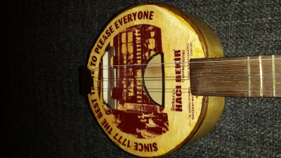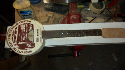 Έμεινε στο ράφι επί μακρόν και τελικά καταπιάστηκα μαζί του πριν από ένα χρόνο περίπου ταυτόχρονα με μια καρύδα και αυτή περίπου το ίδιο παλιά. Αχ σχέδια που μένουν σχέδια! Βλέποντας το κουτί μου έδινε την εντύπωση πως ήταν από μασίφ ξύλο, άποψη που καταρίφθηκε μόλις άρχισα να το δουλεύω και κατάλαβα πόσο φτηνοκατασκευή. Χαλάστηκα.  Αυτός ήταν και ο δεύτερος λόγος μαζί με την έλειψη χρόνου που δεν μου έκανε κέφι να συνεχίσω την κατασκευή  και για αυτό καθυστέρησα τόσο να το τελειώσω. Η όλη κατασκευή δεν ήταν μασίφ ξύλο αλλά ένα είδος κόντρα πλακέ κακίστης ποιότητας . Εσωτερικά είχε ένα ξύλο χαμηλής πυκνότητας σε δυο στρώσεις με καθετα μεταξύ του νερά,  με κάμποσα κενά και πάνω κάτω καπλαμά από λευκό και πολύ μαλακό πανάλαφρο ξύλο και με ρόζο παρακαλώ. Δίνω λεπτομέρειες αρκετές για να τονίσω πόσο ακατάλληλο μου φάνηκε σαν υλικό οργανοποιίας.  Λοιπόν με βαριά καρδιά συνέχισα την δουλειά.
