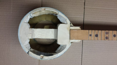 Το τενεκεδένιο "ηχείο" άδειο ( σχεδόν ). Τα λεπτά , λοξά και εύκαμπτα χείλη του , μόνο προβλήματα μου προκάλεσαν. Το είχα δει από την αρχή και ήθελα να κόψω τα λοξά στο ηχείο πιο κάτω , εκεί που η επιφάνειά του είναι κάθετη ως προς τον πάτο του, αλλά είπα να το ρισκάρω για χάρη του όγκου ...