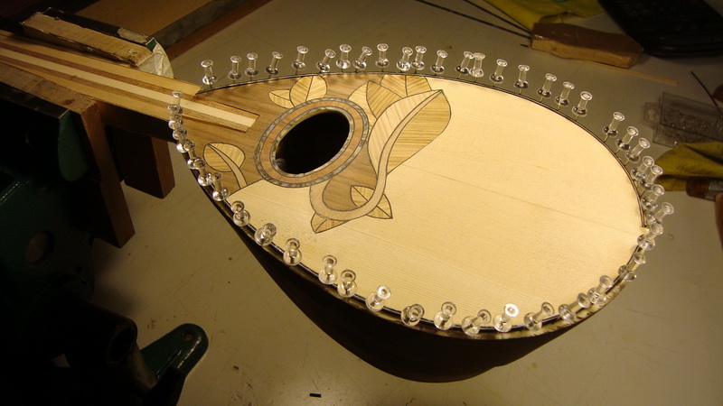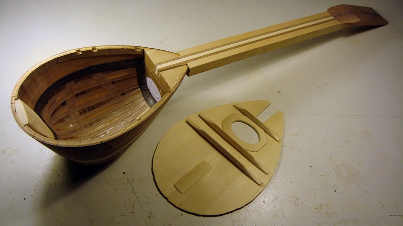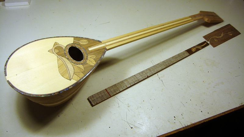 Έτσι ξεκίνησα χωρίς πολλές - πολλές απαιτήσεις και με υλικά περισσεύματα από τα δυο μπουζούκια: αφρικ. καρυδιά και κερασιά, ακόμα και ήδη λυγισμένες ντούγες χρησιμοποίησα.