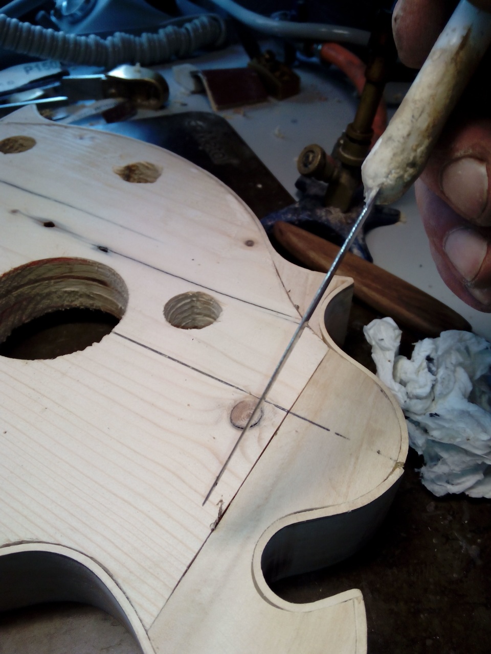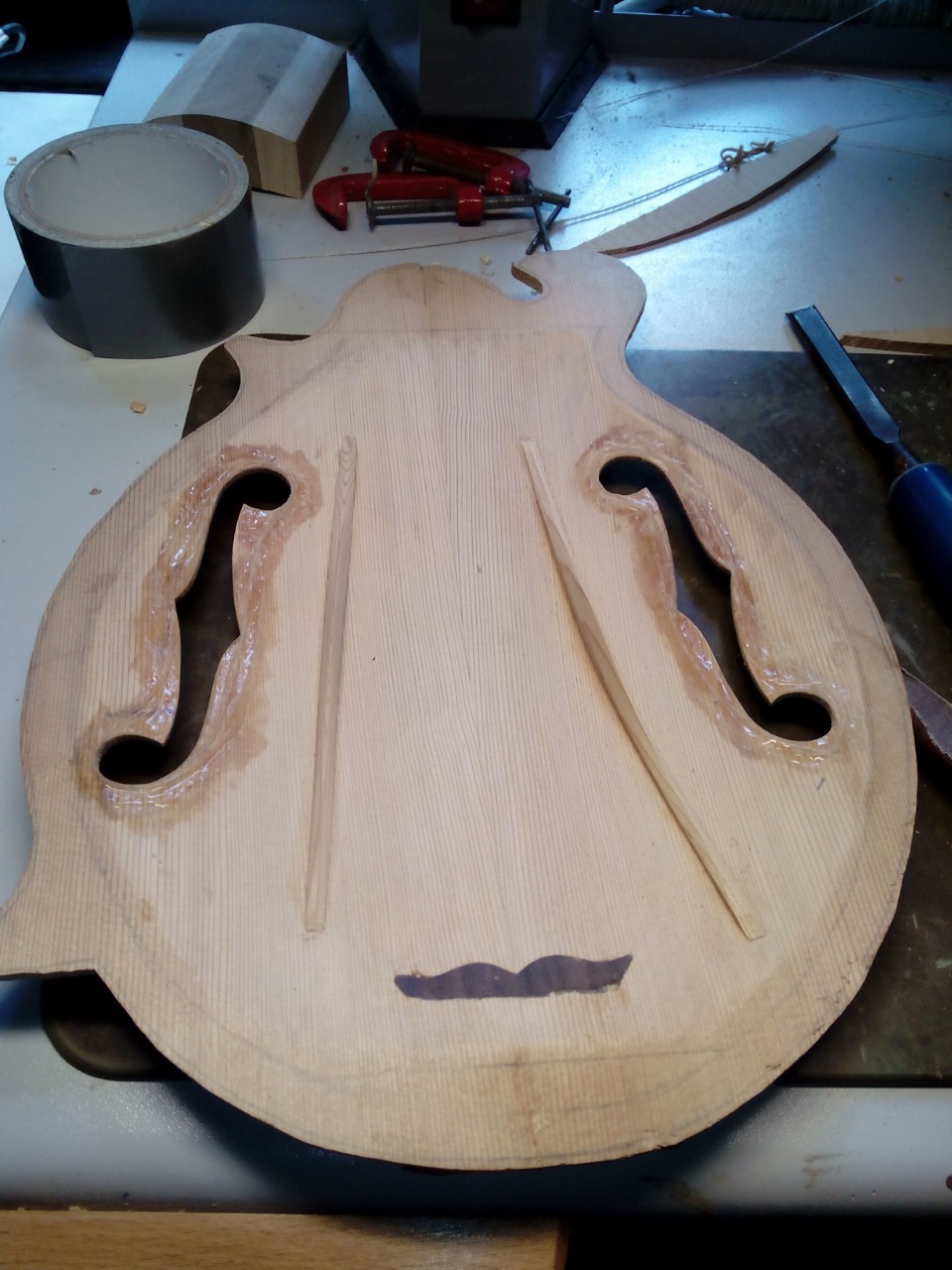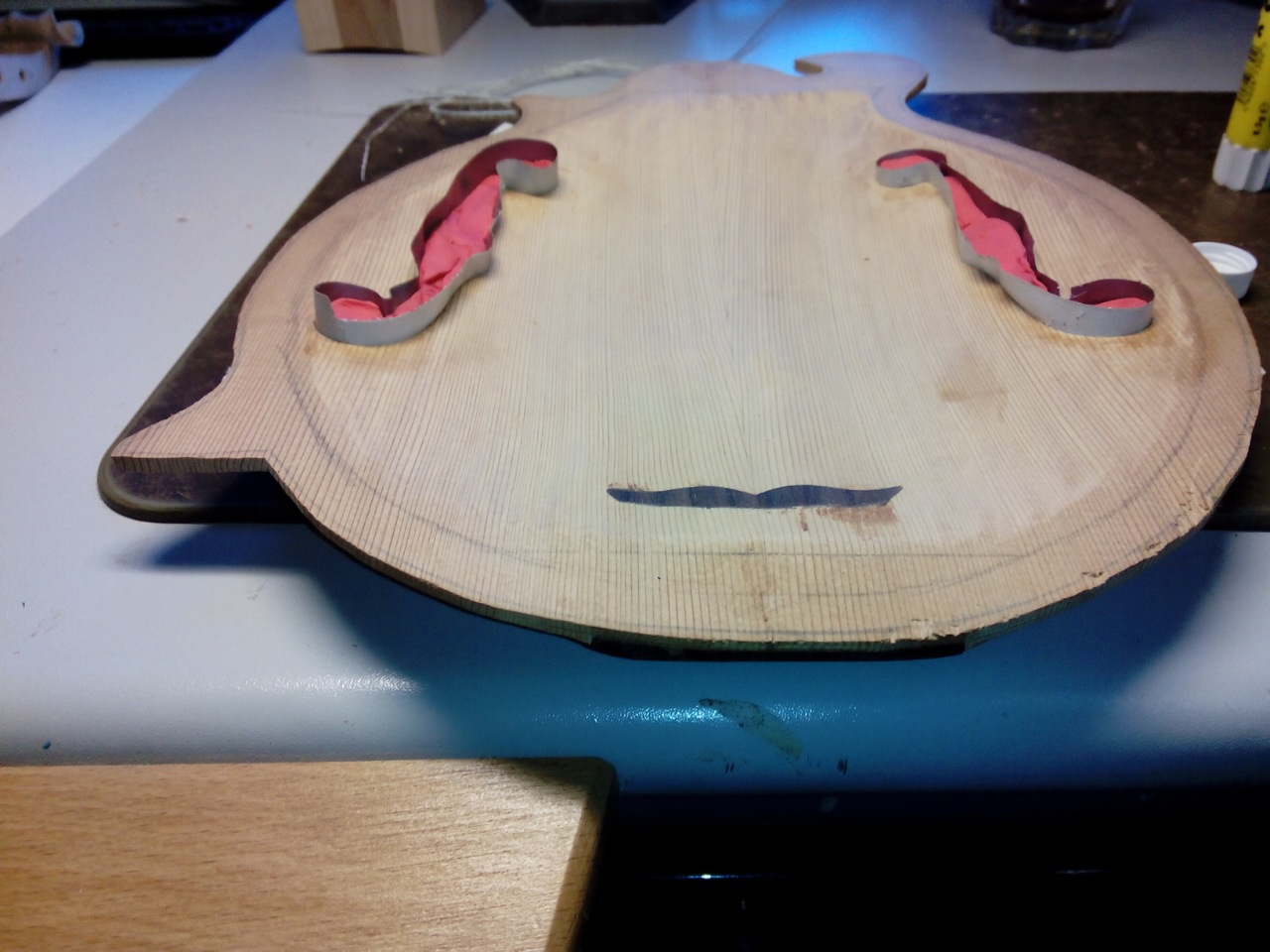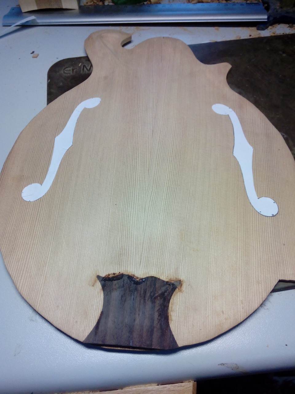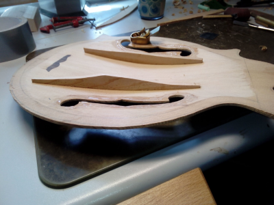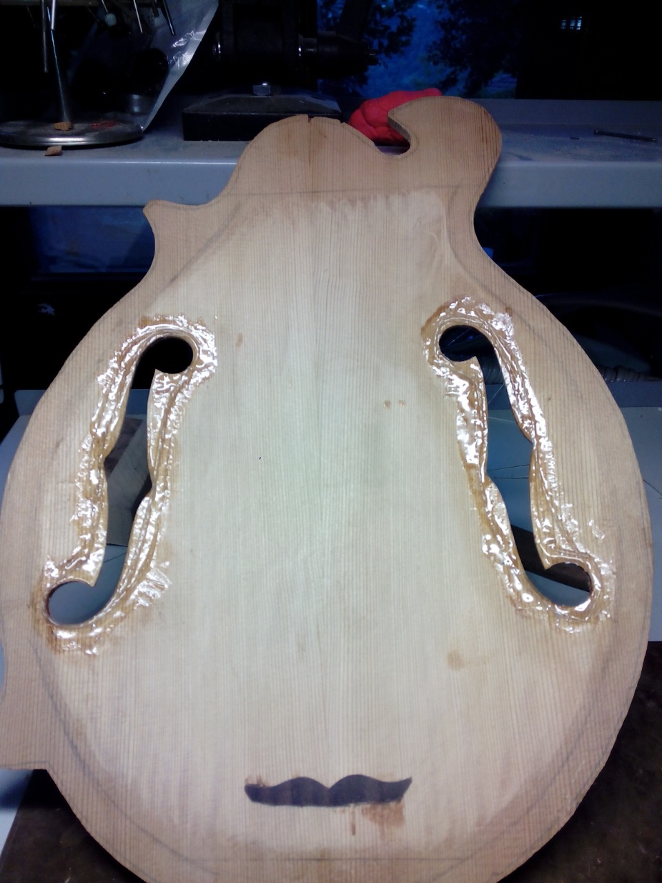 Το μπροστά καπάκι είναι κέδρος και εσωτερικά στα f holes πειραματίστηκα  λίγο και έβαλα ελαστικό εποξικο με ενίσχυση απο υαλονημα.