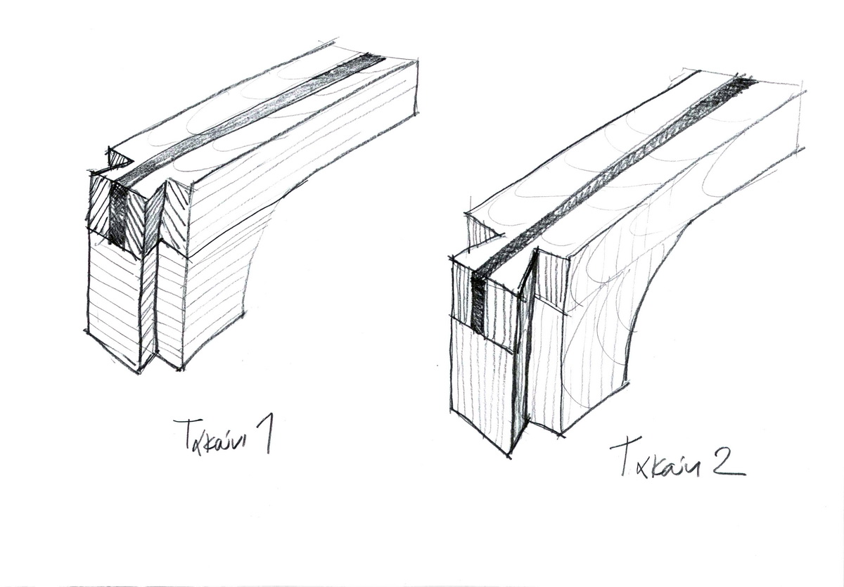 Κώστα έκανες το καλυτερο, και ο κύριος Βασιλειάδης κατά την ταπεινή μου άποψη σου πρότεινε το σωστότερο τρόπο από άποψη αντοχής διότι τα νερά στο κόντρα πλακέ "σταυρώνουν" οπότε δεν υπάρχει φόβος σκισίματος κατά την σύσφιξη του μάνικου στον τάκο, και στην πίεση που ασκήτε στον τάκο από της χορδές, επίσεις μια μέρα με πήρε ο Ανέμελος και πήγαμε σε ένα μάθημα οργανοποιίας που κάνει κύριος Φώτης ο Δουρίδας, και εκείνη την ήμερα έλεγε για τον τάκο και είπε πως καλό είναι να κάνουμε επικολλητό τάκο με κόντρα πλακέ, δηλαδή να βάλουμε στρώσεις από φλαμούρι και κόντρα πλακέ για να αποφύγουμε σκισίματα από συστολές-διαστολές, το θεώρησα πολύ λογικό και σωστό γιατι σε εκείνο το σημείο αν προκληθεί η οποιαδήποτε ζημια, το σημείο δεν ειναι προσβάσιμο για επισκευή, οπότε βγαίνει σε αχρηστία όλο το όργανο, τώρα αν δεν έχουμε κόντρα πλακέ εγώ θα προτιμούσα ο τάκος να τοποθετηθεί με τα νερά, και να κατασκευαστή όπως δείχνω στο σκιτσάκι παρακάτω
