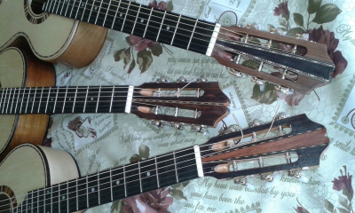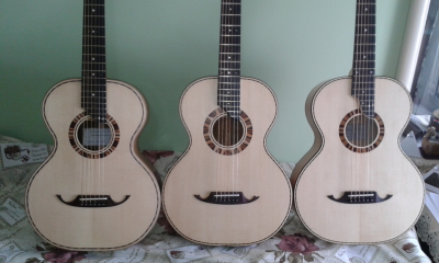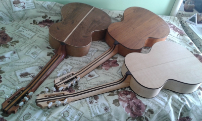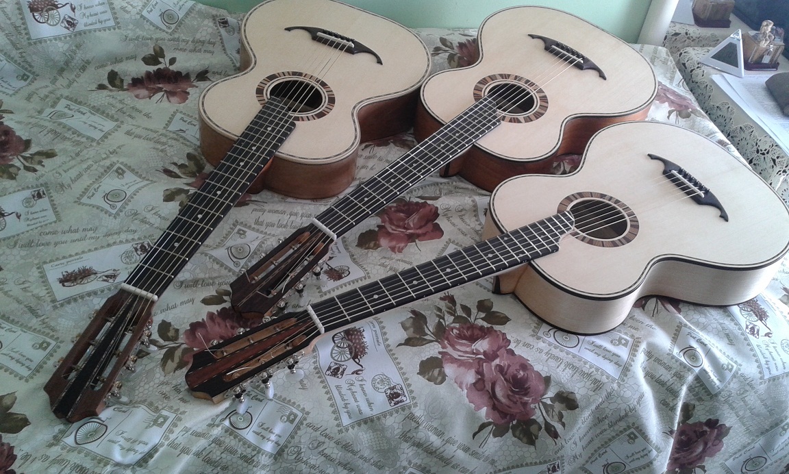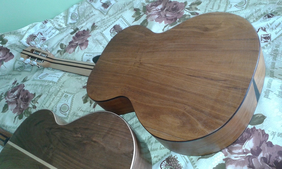 Στα κιθαρόνια που δείχνω παρακάτω έχω ακριβώς τον ίδιο οπλισμό, είναι στο ίδιο καλούπι φτιαγμένα,έχω τις ίδιες διαστάσεις ,την ίδια κλίμακα κλπ , οι μόνες διαφορές που υπάρχουν είναι καθαρά εμφανισιακές (δεν νομίζω οτι παίζει ρόλο αυτο στον τελικό ήχο) και η βασική διαφορά τους είναι το διαφορετικό ξύλο για το σκάφος (καρυδιά-μουριά,το αγαπημένο μου και σφενδάμι)