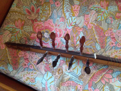 κάτοψη σκάφους , τά μαῦρα εἶναι λάστιχα περασμένα στα κουρδιστηράκια γιά νά μήν τσιρίζουν ἀκουμπῶντας στίς χορδές .