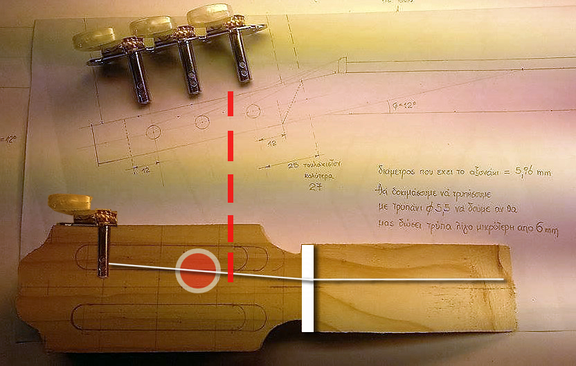 Επίσης πρόσεξε αυτό το σημείο: στην κάτοψη είναι πιθανό η χορδή να συναντιέται με το κεντρικό στέλεχος του headstock σε άλλο σημείο (κύκλος) απ 'ο,τι φαίνεται στην τομή (διακεκομμένη). Βέβαια στην φωτογραφία το headstock με το σχέδιο δεν είναι ευθυγραμμισμένα, αλλά αν αλλάξεις κλειδιά και τυχαίνει να έχουν την τρύπα αλλού πιθανόν να έχεις εκπλήξεις. Ίσως είναι καλύτερα να χρησιμοποιήσεις κλειδιά με την τρύπα στην μέση του άξονα.
