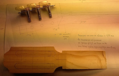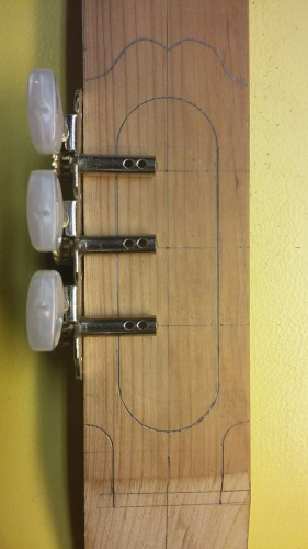Στο λέω γιατί την πάτησα με την κιθάρα (πρώτη φορά έφτιαχνα τέτοιο headstock, είχε και ιδιαίτερα φαρδύ κεντρικό στέλεχος) και αναγκάστηκα να ανοίξω νέες τρύπες στα πάνω κλειδιά (γίνεται κι αυτό, αλλά αν μπορείς να το αποφύγεις...). Τσέκαρέ το με τα κλειδιά που θα χρησιμοποιήσεις τελικά.